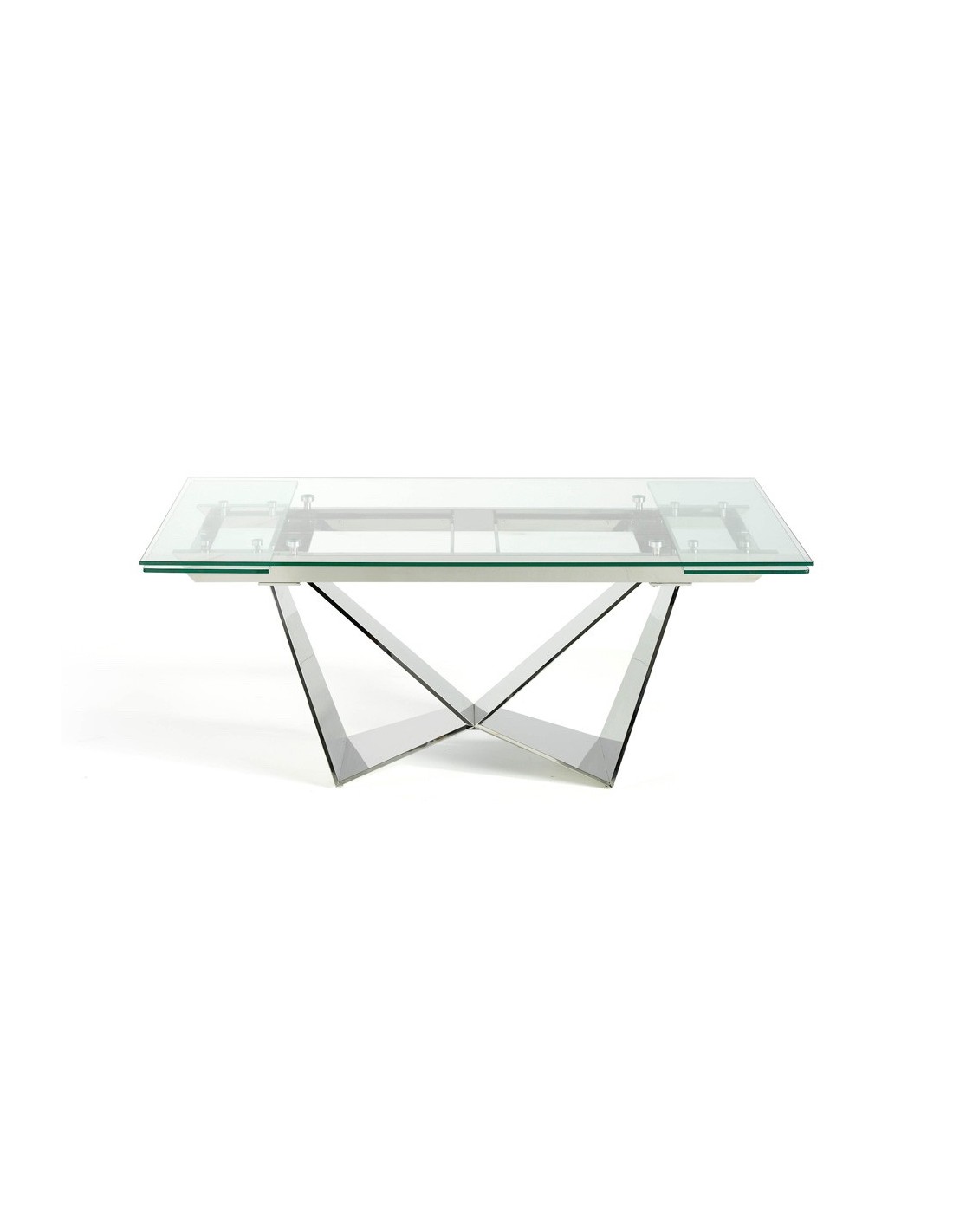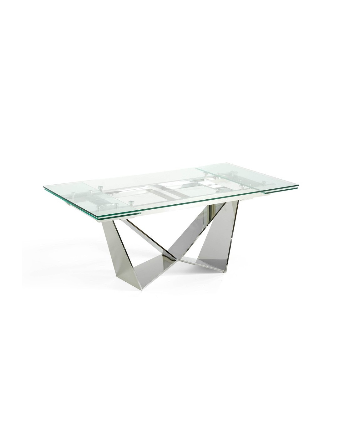 Mesa comedor extensible rectangular cristal templado y acero cromado Mesa comedor extensible rectangular de diseño moderno con tapa de cristal templado. Sus patas de acero inoxidable cromado así como su adaptabilidad, la convierten en un mueble totalmente funcional y versátil para el día a día.Medidas del producto: 160 x 90 x 75 cm.Esta mesa comedor cuenta con 2 extensibles de 30 cm., pudiendo ampliarla de 160 a 220 cm.- Su tapa de cristal templado de 12 mm de espesor es resistente, duradera, y favorece la sensación de amplitud en el espacio. - La originalidad de sus patas aúnan el estilo más vanguardista de nuestra marca con la mayor calidad y comodidad para sus comensales. - El perfil de la tapa pulido de esta mesa de comedor ofrece un acabado de alta calidad, siendo además, sinónimo de comodidad y elegancia. - La transparencia del cristal, deja ver el mecanismo de apertura extensible de esta mesa, haciendo así, que su diseño sea mucho más único e innovador. - Apta para un máximo de 8 comensales.
