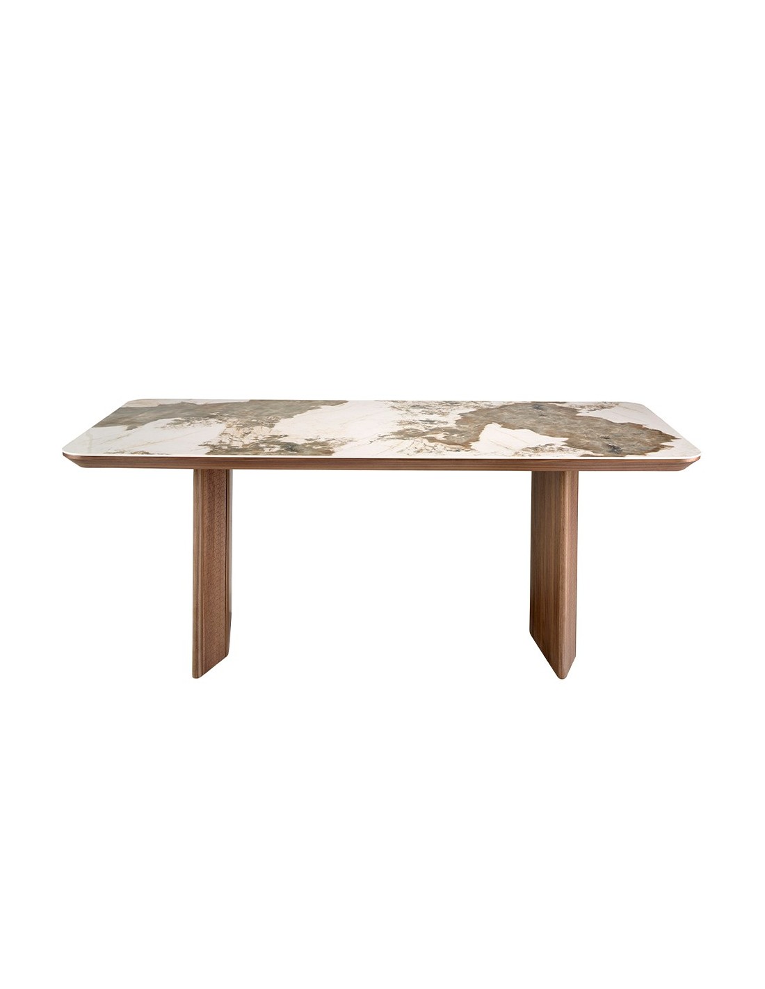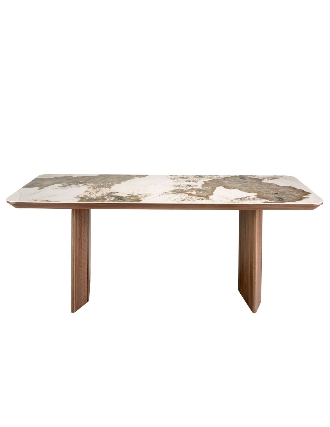 Mesa comedor rectangular mármol porcelánico y nogal Mesa comedor rectangular de diseño moderno con tapa fija de mármol porcelánico blanco con vetas en tonos tierra en acabado brillo. Sus originales patas de madera chapada en nogal natural son elementos claves a destacar de su diseño.Medidas del producto: 200 x 90 x 77 cm.- Su tapa de mármol porcelánico es resistente y duradera, ofreciendo además un toque de vanguardia y elegancia al ambiente. - Sus patas robustas y de carácter lineal permite combinarla con cualquier silla de nuestro catálogo, sin molestar o interferir en la comodidad de los comensales. - El perfil de la tapa biselado de esta mesa de comedor ofrece la máxima calidad en acabado y comodidad. - Apta para un máximo de 8 comensales. - El original grabado con motivos geométricos en sus patas, la hace todavía más especial y única.