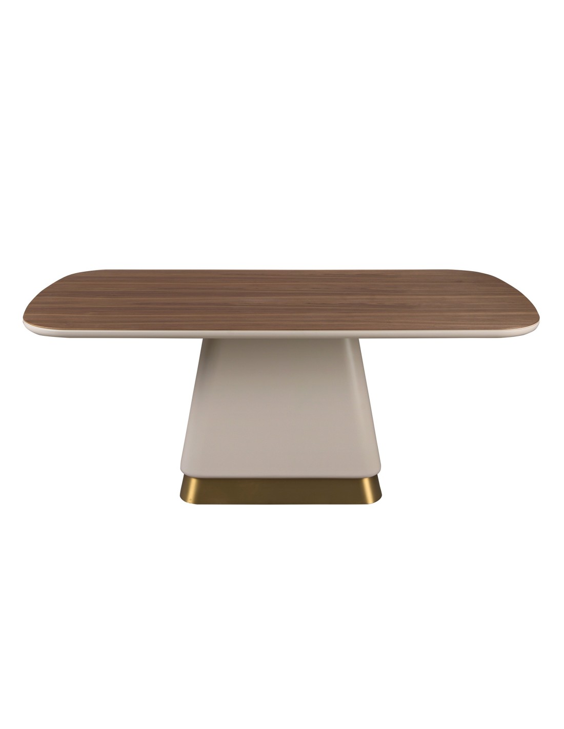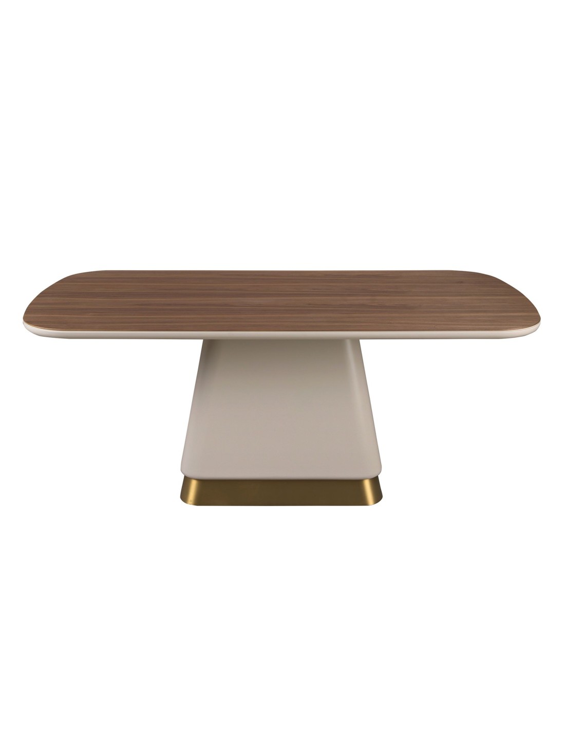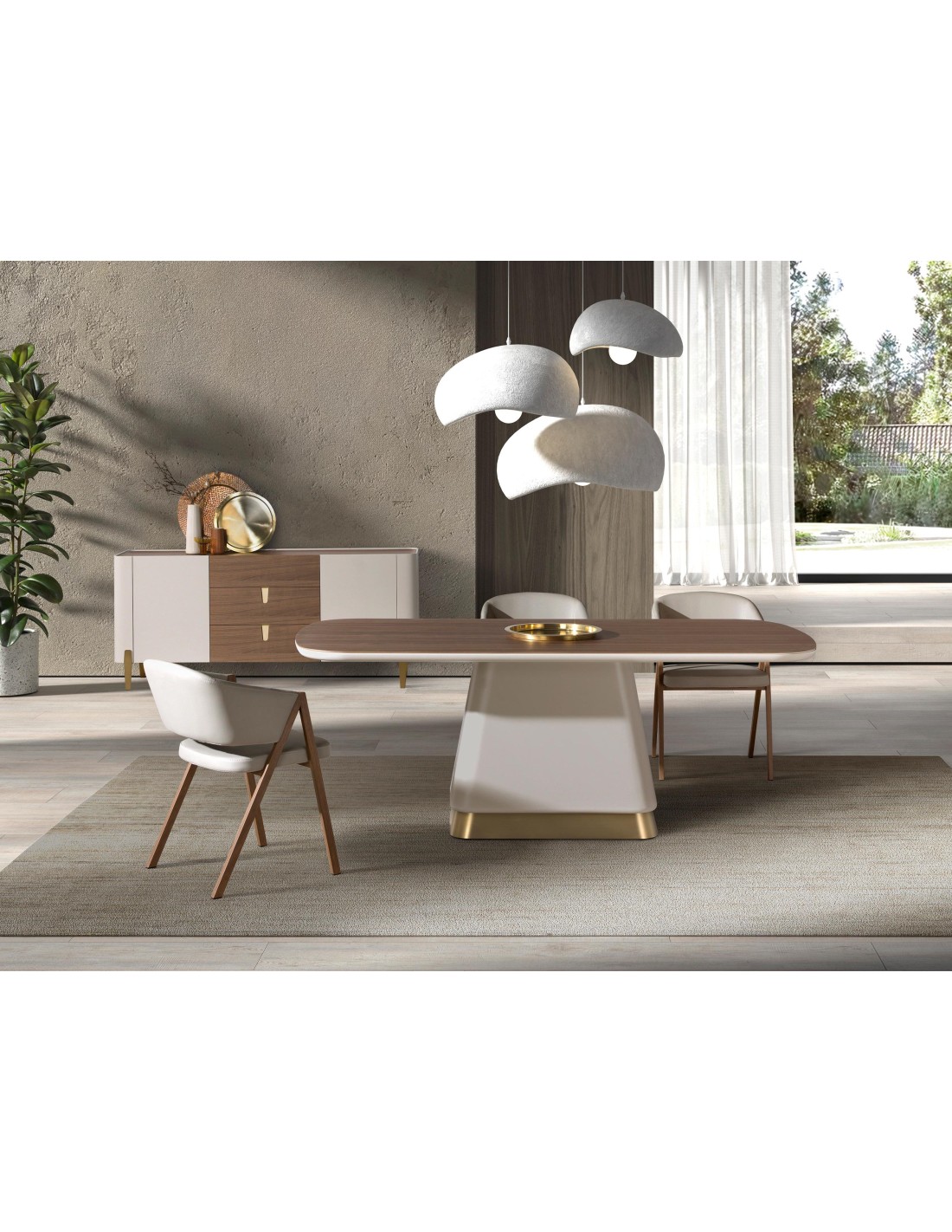 Mesa comedor rectangular nogal y madera beige Mesa comedor rectangular de diseño moderno con tapa fija de madera chapada en nogal natural. Sus originales patas de madera de MDF color beige, junto con su base de base de acero inoxidable pulido color dorado, son elementos claves a destacar de su diseño.Medidas del producto: 200 x 95 x 76 cm.- Su tapa de madera chapada en nogal natural de 0,5 mm de espesor es resistente y duradera, ofreciendo además, un toque moderno y elegante al ambiente. - La originalidad de su estructura aúna modernidad y robustez, así como la mayor comodidad para sus comensales. - El perfil de la tapa biselado de esta mesa de comedor ofrece la máxima calidad en acabado y comodidad. - Apta para un máximo de 8 comensales. - El detalle dorado de su base encajará a la perfección con diferentes estilos decorativos, creando un ambiente cálido y acogedor.
