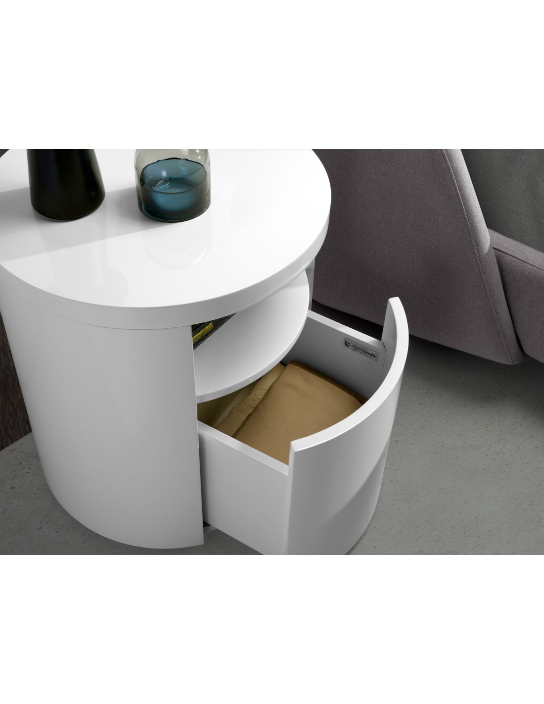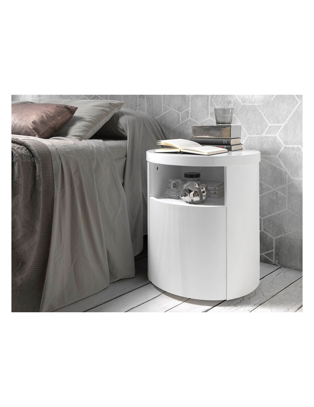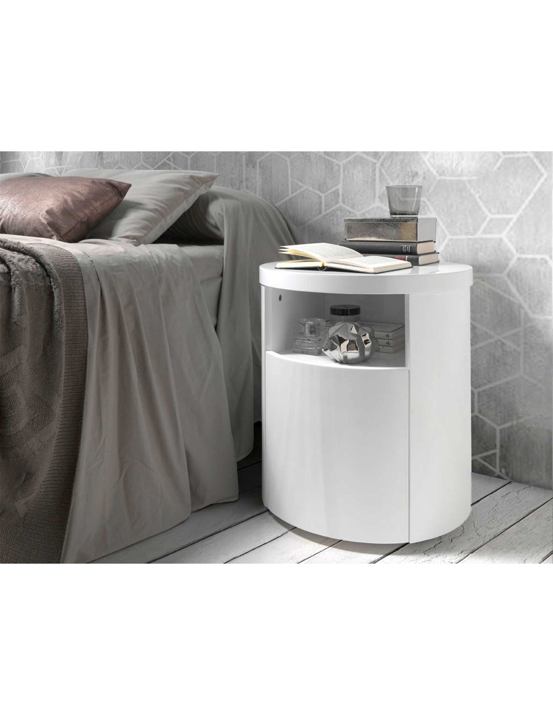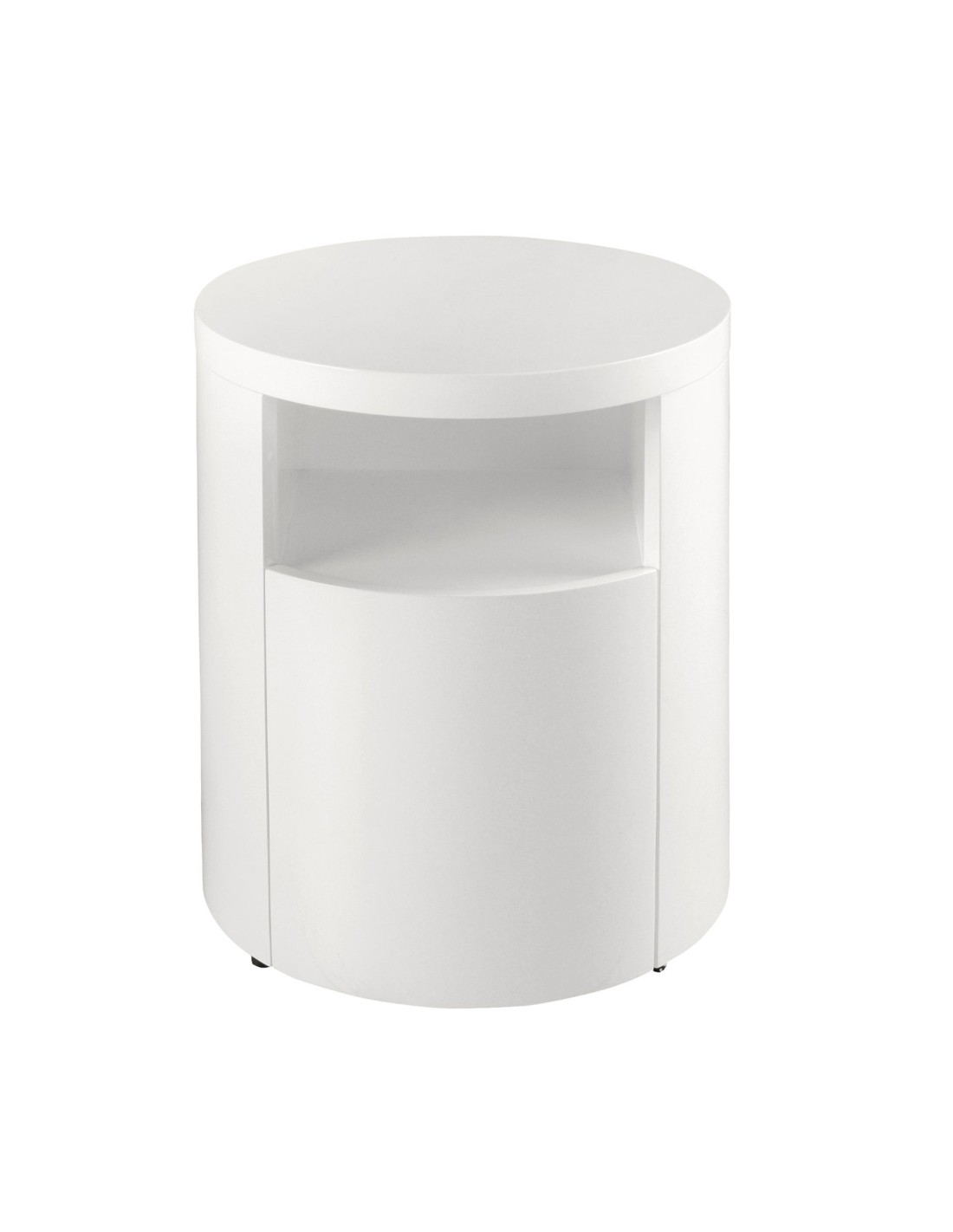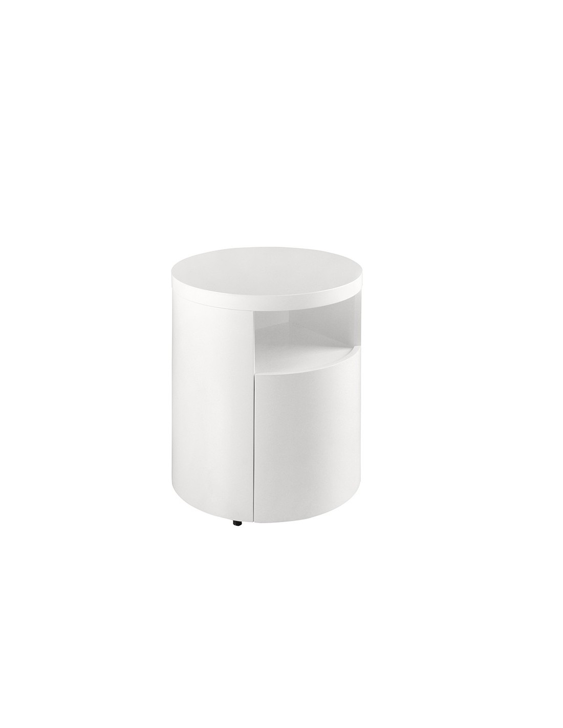 Mesita de noche madera blanca Mesita de noche de diseño moderno con estructura de madera de MDF color blanco. Cuenta con un amplio espacio de almacenaje con 1 cajón con sistema de apertura uñero y cierre soft-closing. Medidas del producto: Ø48 x 55 cm.- Gracias a su acabado lacado, esta mesita de noche es ideal para crear un ambiente con carácter y personalidad, sin dejar de lado la parte más funcional y práctica para el día a día. - Versátil y funcional, su diseño permite que encaje en cualquier ambiente, convirtiéndose en un elemento clave de la decoración de su hogar. - Tanto por su tamaño como por su gran espacio de almacenaje es ideal para mantener todo en orden y en su sitio.