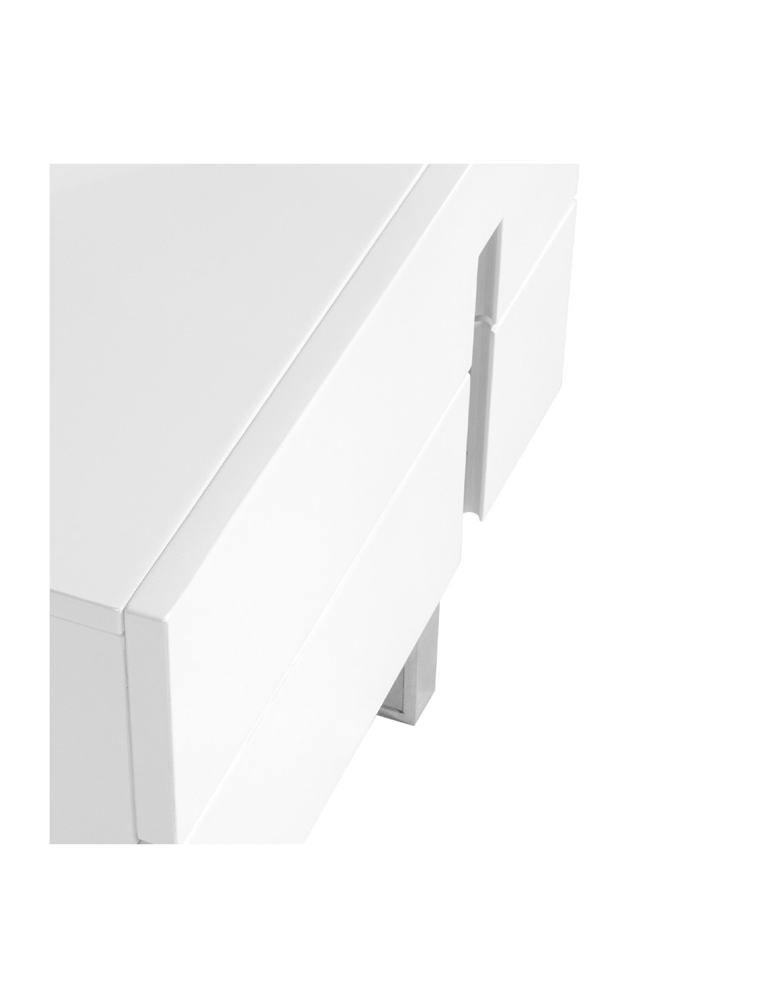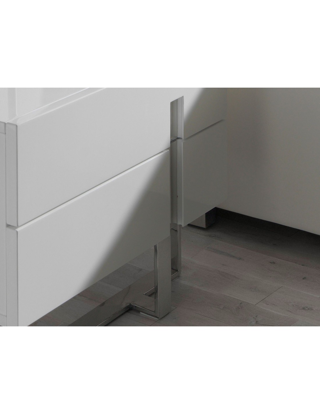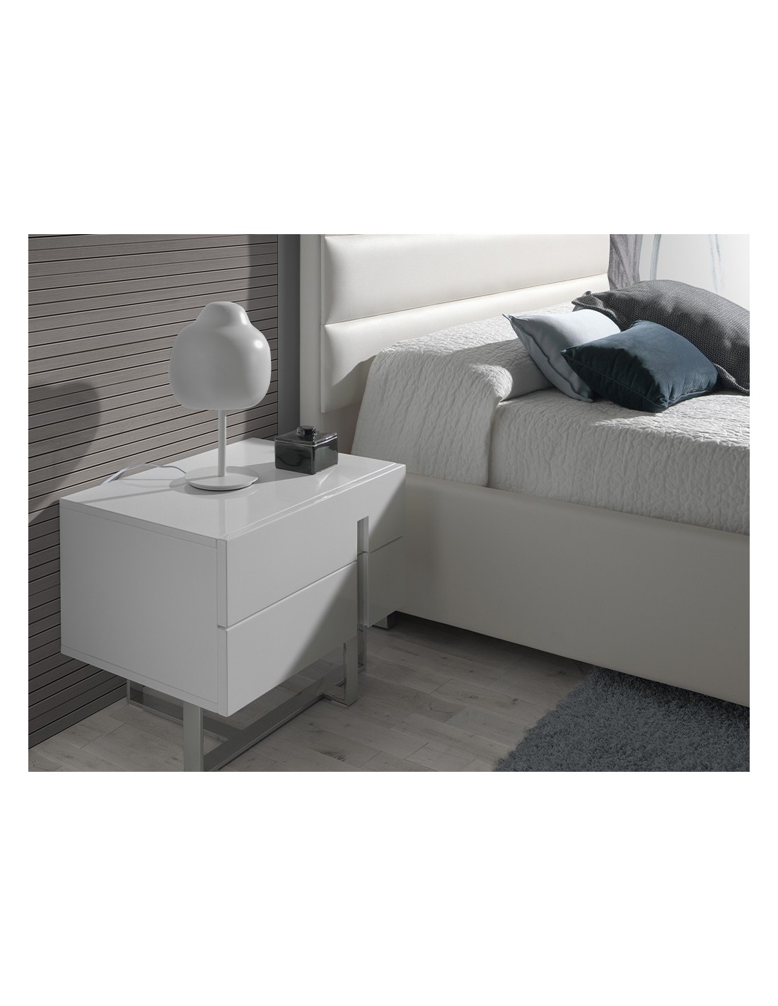Mesita de noche madera blanco y acero cromado Mesita de noche de diseño moderno con estructura de madera de MDF color blanco y unas originales patas de acero inoxidable cromado. Su original detalle en acero inoxidable cromado aporta el toque de estilo ideal para tu salón. Cuenta con un amplio espacio de almacenaje con 2 cajones con sistema de apertura uñero y cierre soft-closing. Medidas del producto: 60 x 42 x 45 cm.- Gracias a su acabado lacado, esta mesita de noche es ideal para crear un ambiente con carácter y personalidad, sin dejar de lado la parte más funcional y práctica para el día a día. - La originalidad de sus patas en acero inoxidable cromado aúnan el estilo más vanguardista de nuestra marca con la mayor calidad y diseño. - Versátil y funcional, su diseño permite que encaje en cualquier ambiente, convirtiéndose en un elemento clave de la decoración de su hogar. - Tanto por su tamaño como por su gran espacio de almacenaje es ideal para mantener todo en orden y en su sitio.
