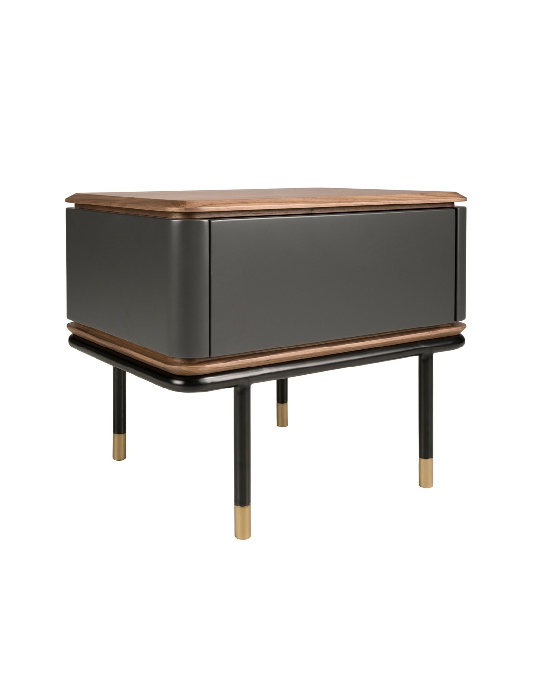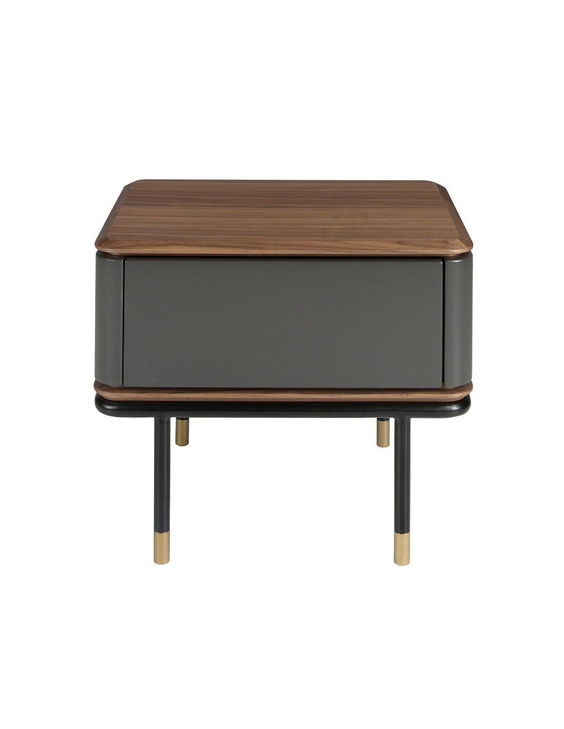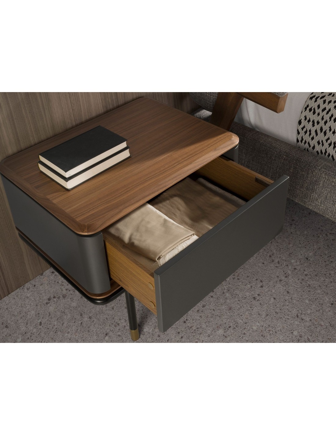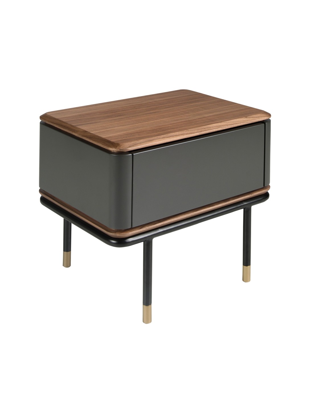 Mesita de noche madera gris oscuro, acero negro y tapa de nogal