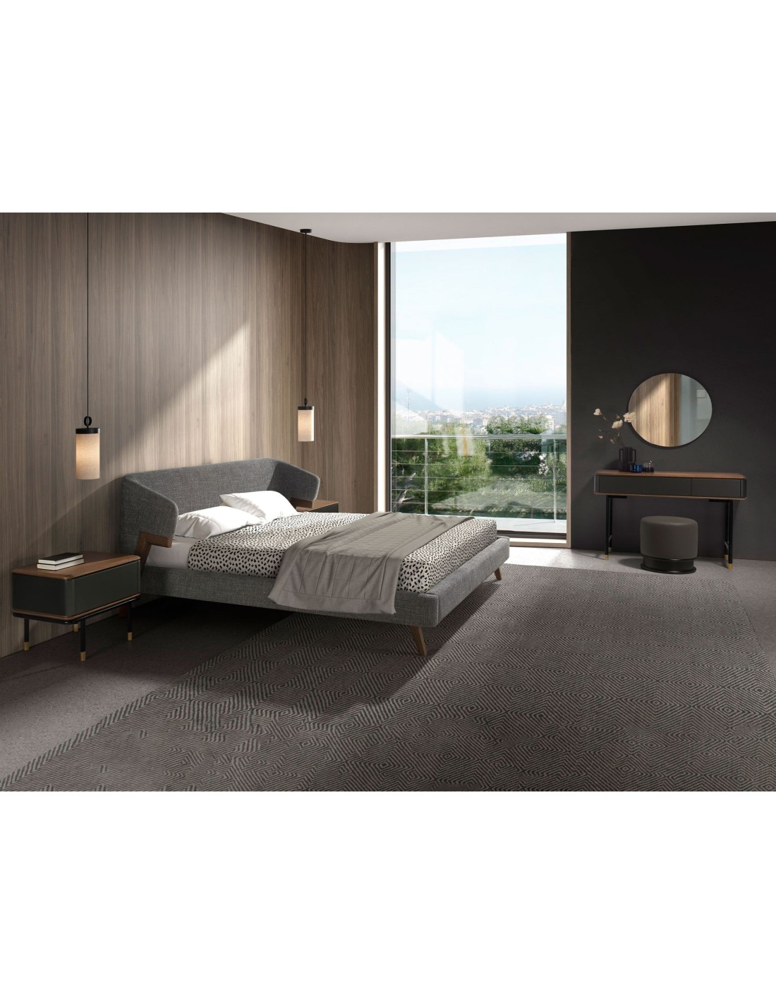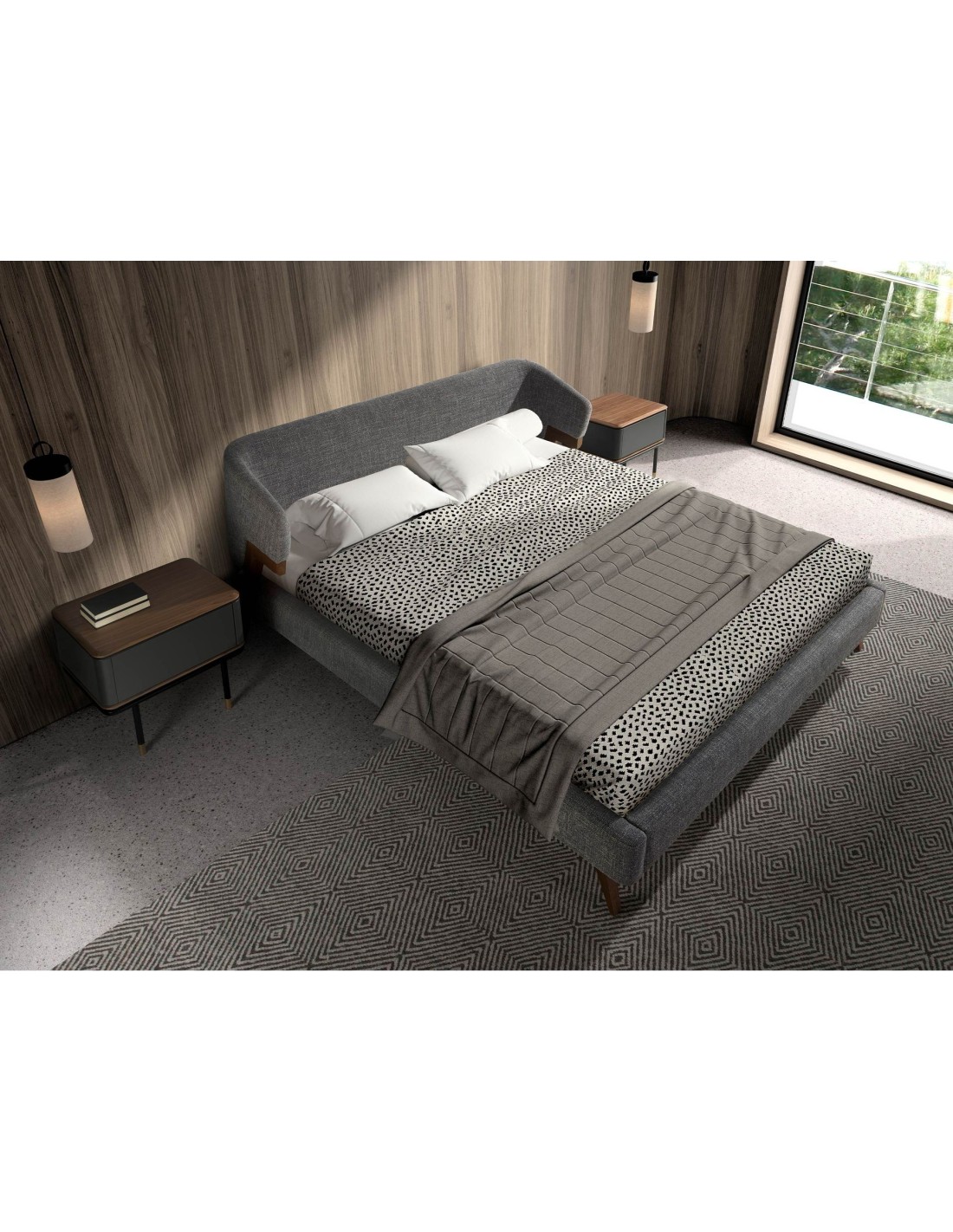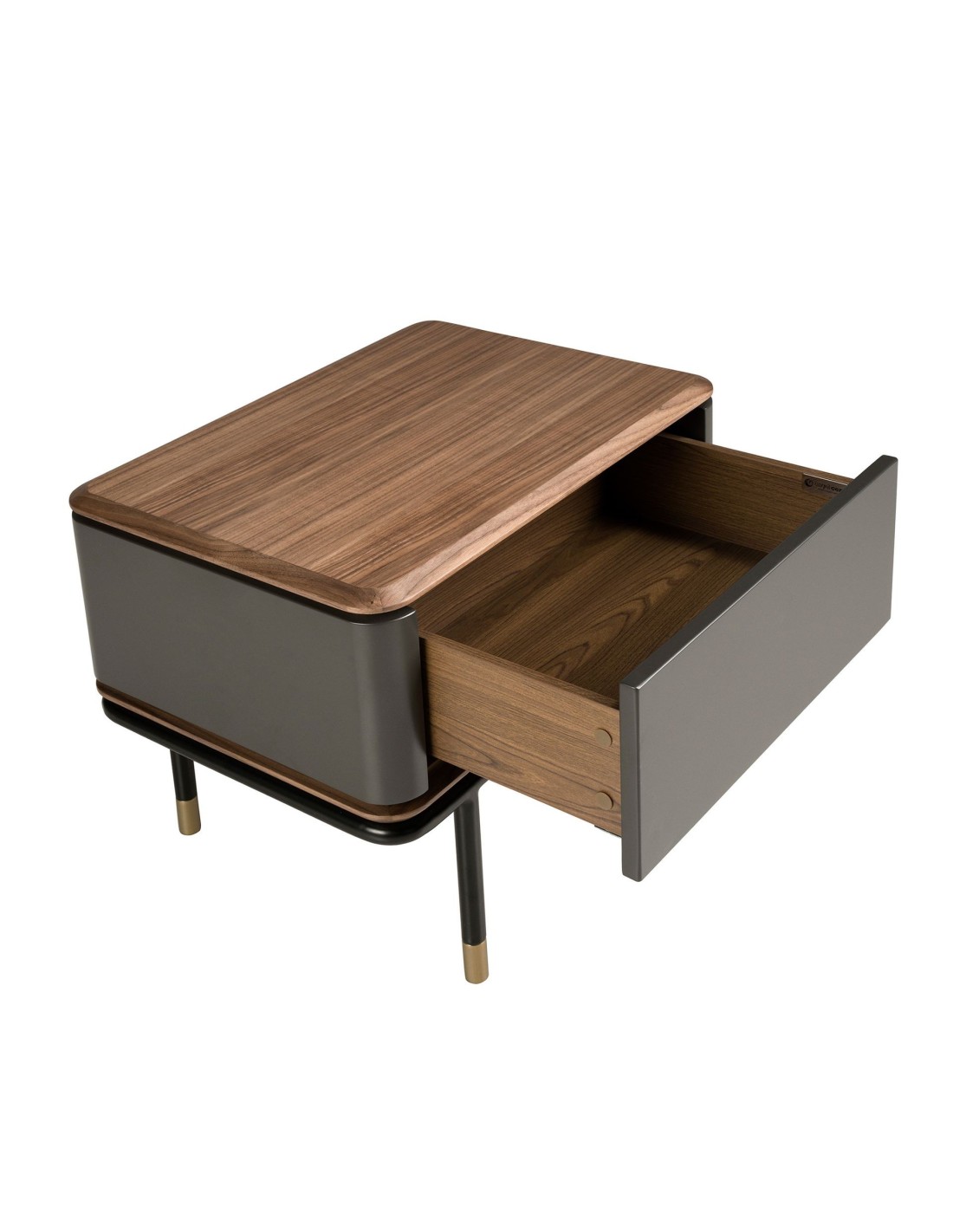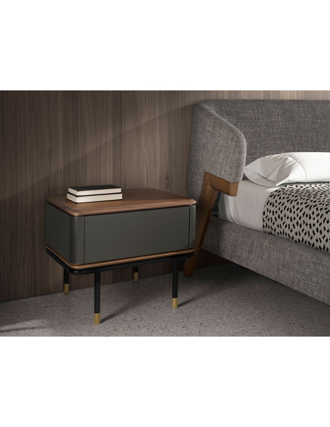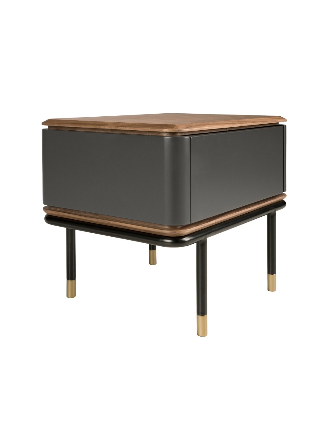 Mesita de noche madera gris oscuro, acero negro y tapa de nogal