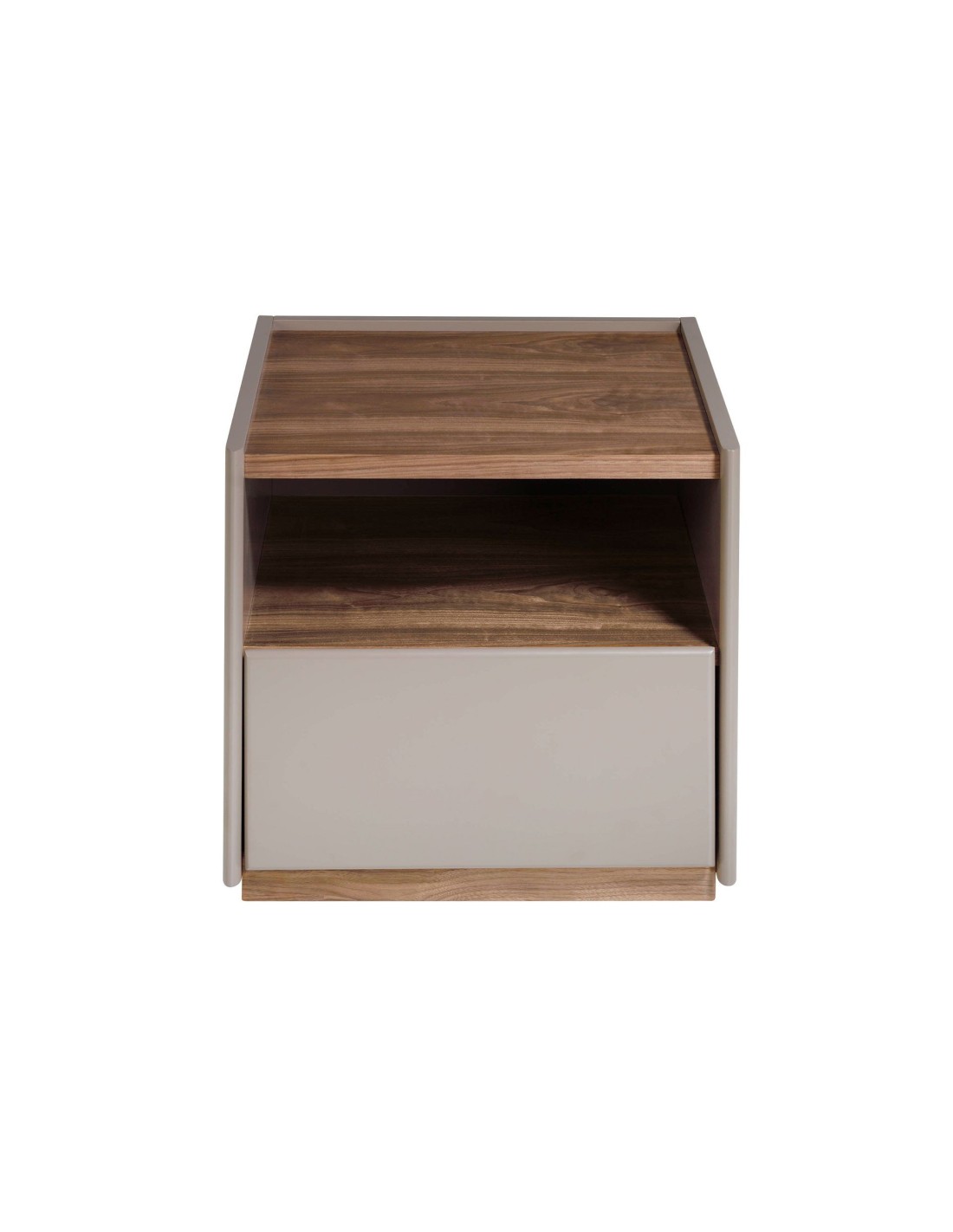 Mesita de noche madera gris y nogal Mesita de noche de diseño moderno con estructura de madera de MDF color gris y una original base de madera chapada en nogal natural. Gracias a su elegante tapa de madera chapada en nogal natural, conseguirá el look sofisticado que busca para sus estancias. Cuenta con un amplio espacio de almacenaje con 1 cajón con sistema de apertura y cierre uñero. Medidas del producto: 50 x 45 x 45 cm.- Tanto por el lacado como por su diseño lineal y moderno, esta mesita de noche se convertirá en la pieza perfecta para su dormitorio. - Versátil y funcional, su diseño permite que encaje en cualquier ambiente, convirtiéndose en un elemento clave de la decoración de su hogar. - Tanto por su tamaño como por su espacio de almacenaje es ideal para mantener todo en orden y en su sitio.