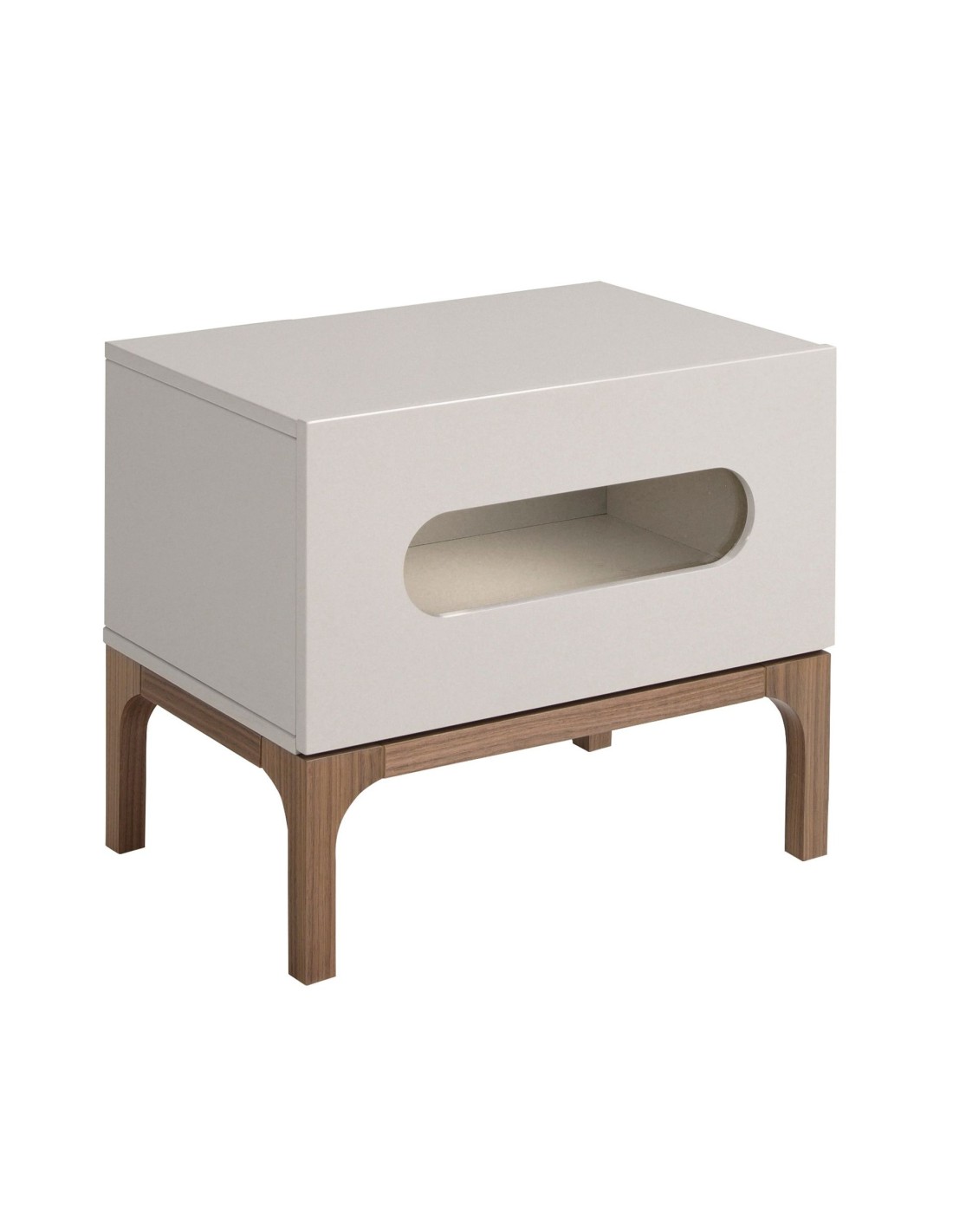 Mesita de noche madera gris y nogal con iluminación interior Mesita de noche de diseño moderno con estructura de madera de MDF color gris y unas originales patas de madera en color nogal. La iluminación interior de esta mesita de noche le permitirá crear un ambiente cálido y relajado, a la vez que ofrece una mejor visión del interior del mueble. Su original detalle en cristal templado aporta el toque de estilo ideal para tu salón. Cuenta con un amplio espacio de almacenaje con 1 cajón con sistema de apertura uñero y cierre soft-closing. Medidas del producto: 60 x 41 x 51 cm.- Tanto por el lacado como por su diseño lineal y moderno, esta mesita de noche se convertirá en la pieza perfecta para su dormitorio. - La robusta estructura de patas de madera en color nogal la convierte en la opción perfecta si lo que busca para su hogar es diseño y mobiliario duradero. - Por su diseño de líneas rectas, aportará un aire de calma y calidez a cualquier estancia. - Si lo que busca es un hogar tranquilo y relajado, esta mesita le ayudará a mantener el orden gracias a su gran espacio de almacenaje. - Su diseño con cajón frontal con hueco frontal de cristal templado e iluminación led interior, la convierte en un mueble auxiliar único, versátil y totalmente adaptable a cualquier dormitorio o zona de descanso.