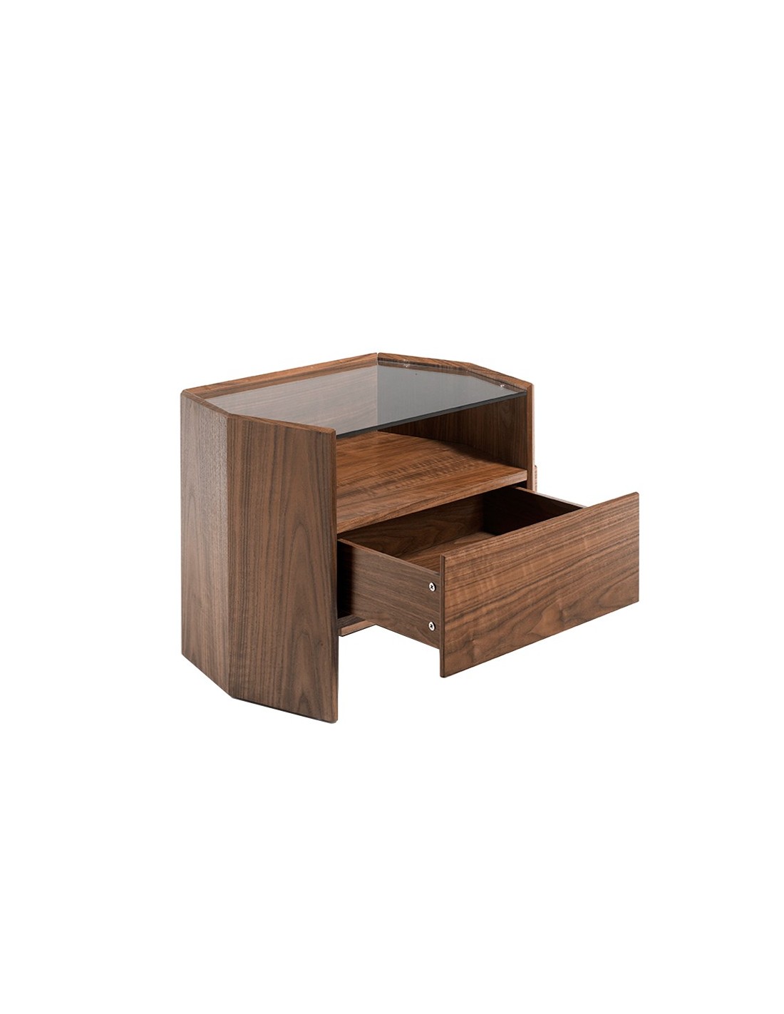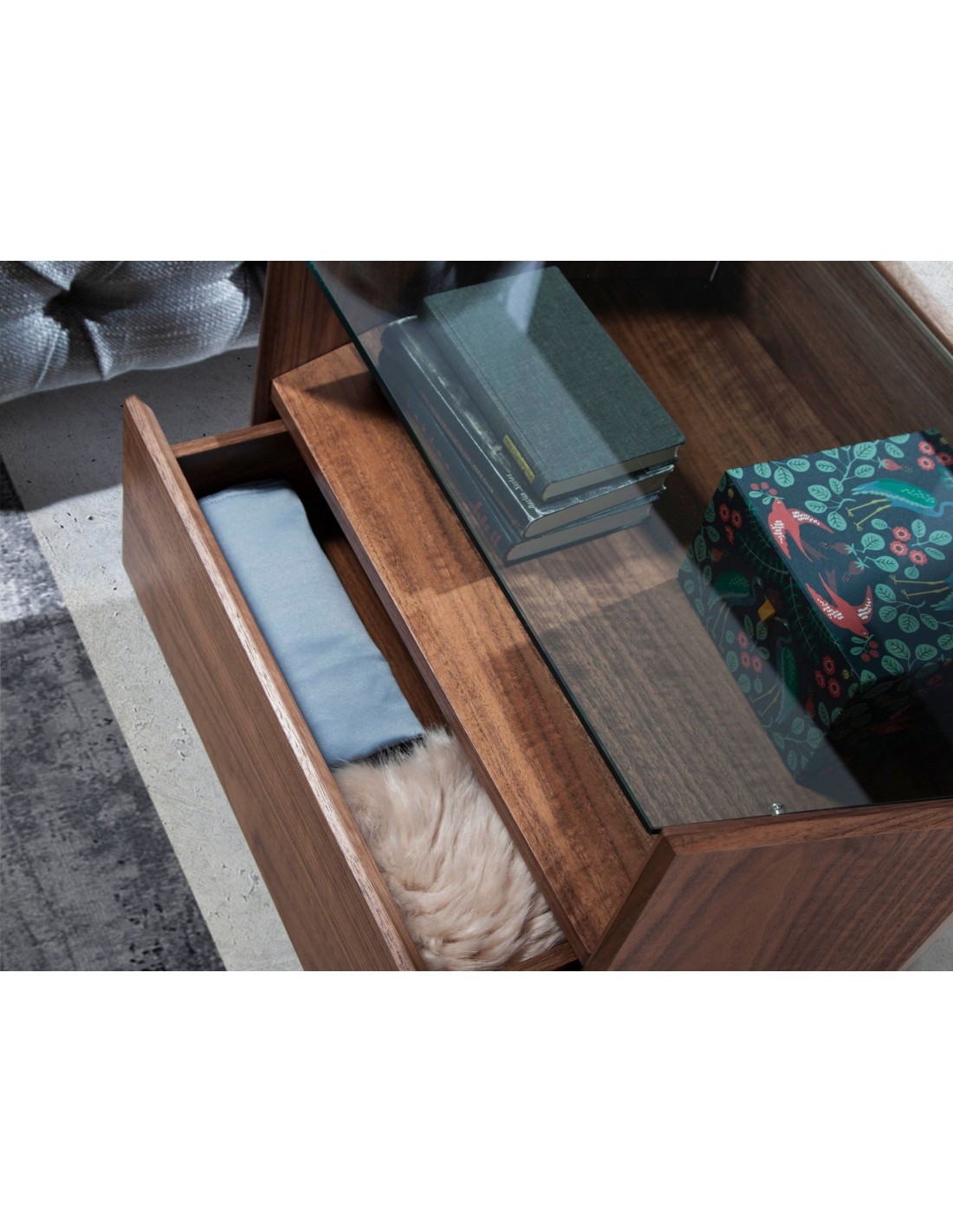 Mesita de noche nogal con tapa de cristal templado Mesita de noche de diseño moderno con estructura de madera chapada en nogal natural y unas originales patas de madera chapada en nogal natural. Gracias a su elegante tapa de cristal templado, conseguirá el look sofisticado que busca para sus estancias. Cuenta con un amplio espacio de almacenaje con 1 cajón con sistema de apertura uñero y cierre soft-closing. Medidas del producto: 65 x 45 x 50 cm.- Esta elegante mesita de noche de madera chapada en nogal natural de 0,5 mm de espesor, aportará el toque diferente y moderno que busca para su dormitorio. - Versátil y funcional, su diseño permite que encaje en cualquier ambiente, convirtiéndose en un elemento clave de la decoración de su hogar. - Tanto por su tamaño como por su gran espacio de almacenaje es ideal para mantener todo en orden y en su sitio.