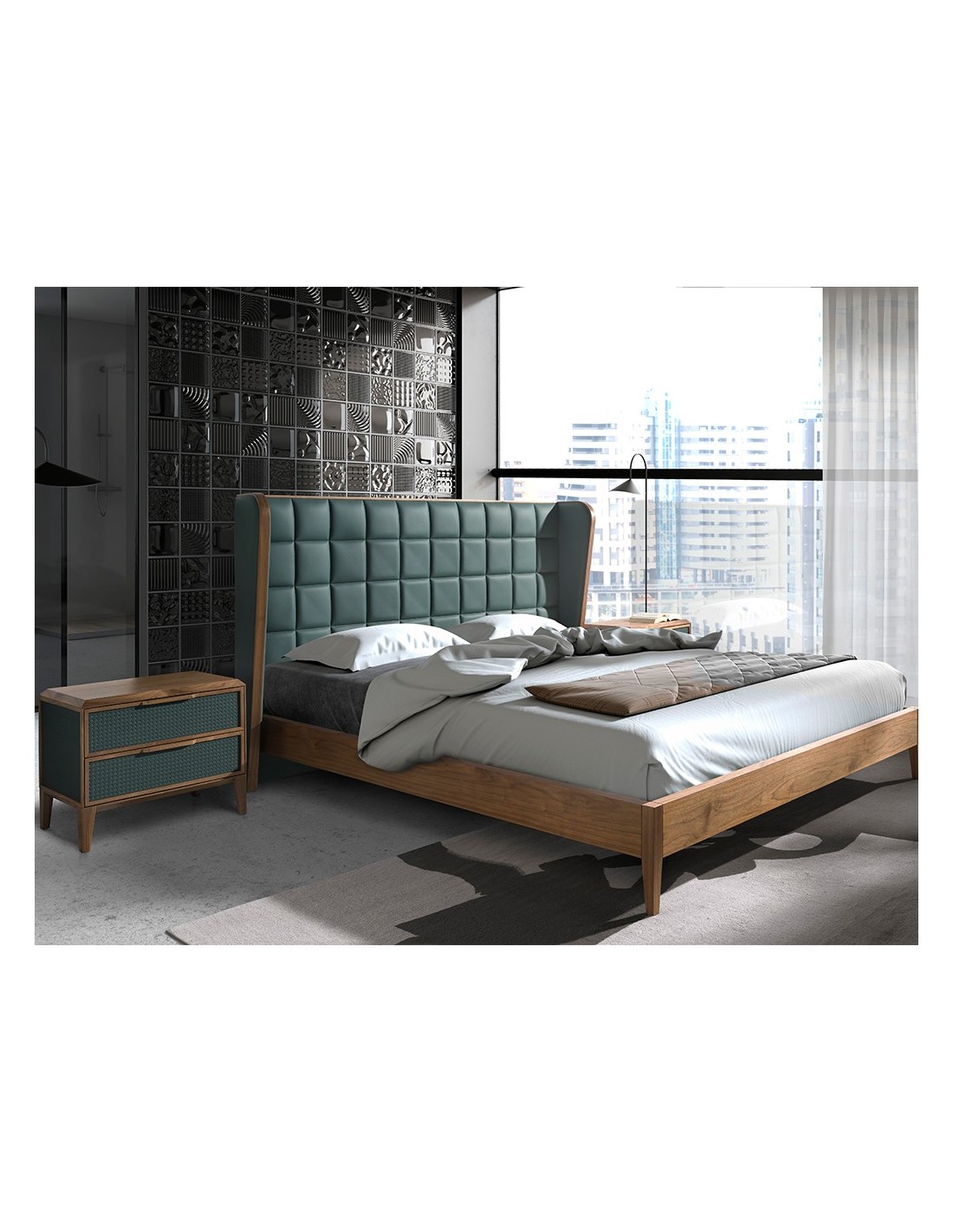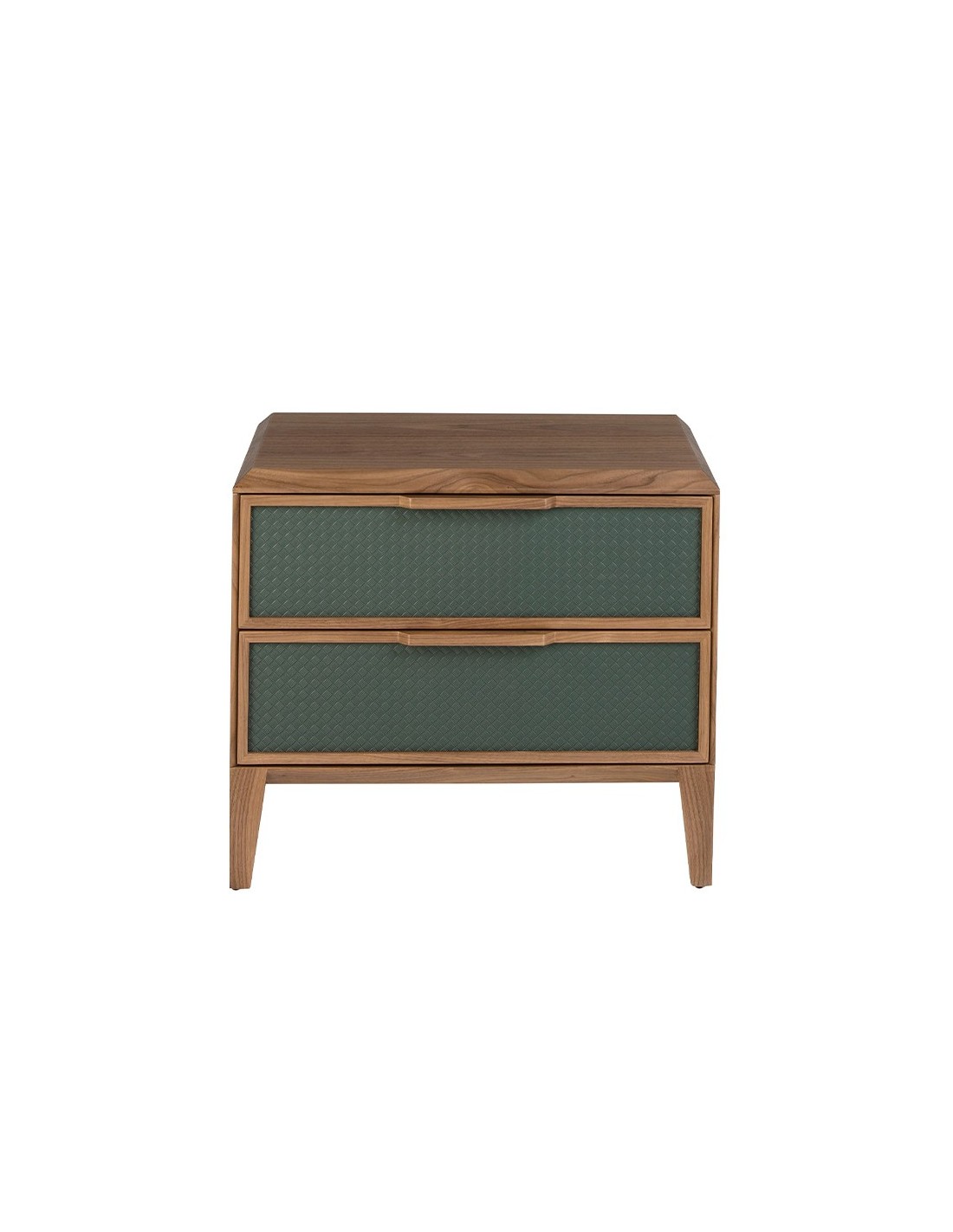 Mesita de noche pvc verde oscuro y nogal Mesita de noche de diseño moderno con estructura de PVC color verde oscuro y unas originales patas de madera chapada en nogal natural. Cuenta con un amplio espacio de almacenaje con 2 cajones con sistema de apertura tirador de lengüeta y cierre soft-closing. Medidas del producto: 60 x 40 x 51 cm.- Este elegante mueble de madera chapada en nogal natural de 0,5 mm de espesor, aportará el toque diferente y moderno que busca para su hogar. - La robusta estructura de patas de madera en color nogal lo convierte en la opción perfecta si lo que busca para su hogar es diseño y mobiliario duradero. - La combinación del PVC verde oscuro con la madera, le confiere un toque cálido a la vez que de máxima tendencia. - Práctico y funcional, gracias a su espacio de almacenaje podrá mantener todo en su sitio, eliminando ruido visual en su dormitorio. - El original revestimiento de PVC verde oscuro con grabado geométrico añade el toque distintivo y exclusivo.