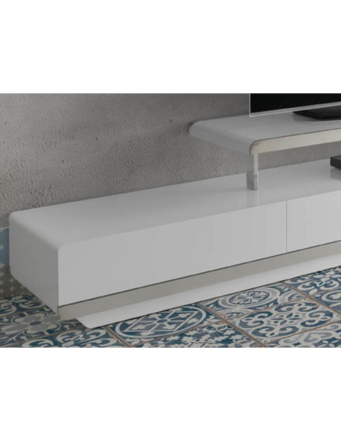 Mueble TV madera blanco y base acero cromado Mueble TV de diseño moderno con estructura de madera de MDF color blanco y una original base de acero inoxidable cromado. Su original detalle en acero inoxidable cromado aporta el toque de estilo ideal para tu salón. Cuenta con un amplio espacio de almacenaje con 2 cajones con sistema de apertura push and pull y cierre soft-closing. Medidas del producto: 200 x 40 x 45 cm.- Tanto por el lacado como por su diseño lineal y moderno, este mueble tv se convertirá en la pieza perfecta para su salón. - Versátil y funcional, su diseño permite que encaje en cualquier ambiente, convirtiéndose en un elemento clave de la decoración de su hogar. - Tanto por su tamaño como por su gran espacio de almacenaje es ideal para mantener todo en orden y en su sitio.
