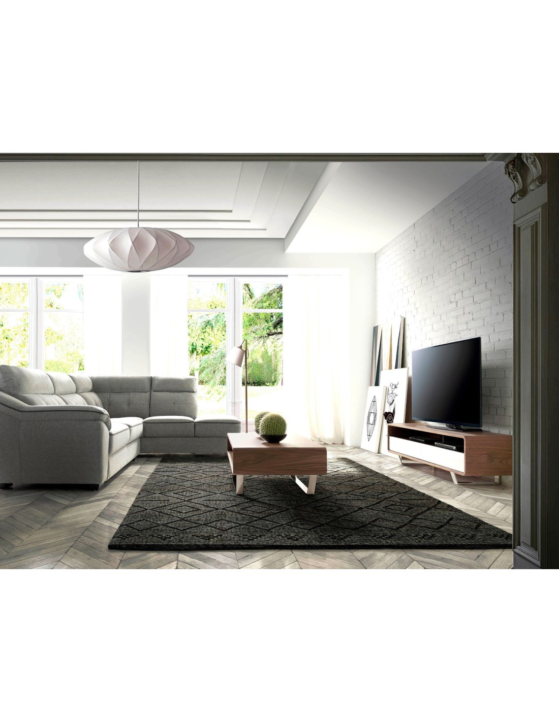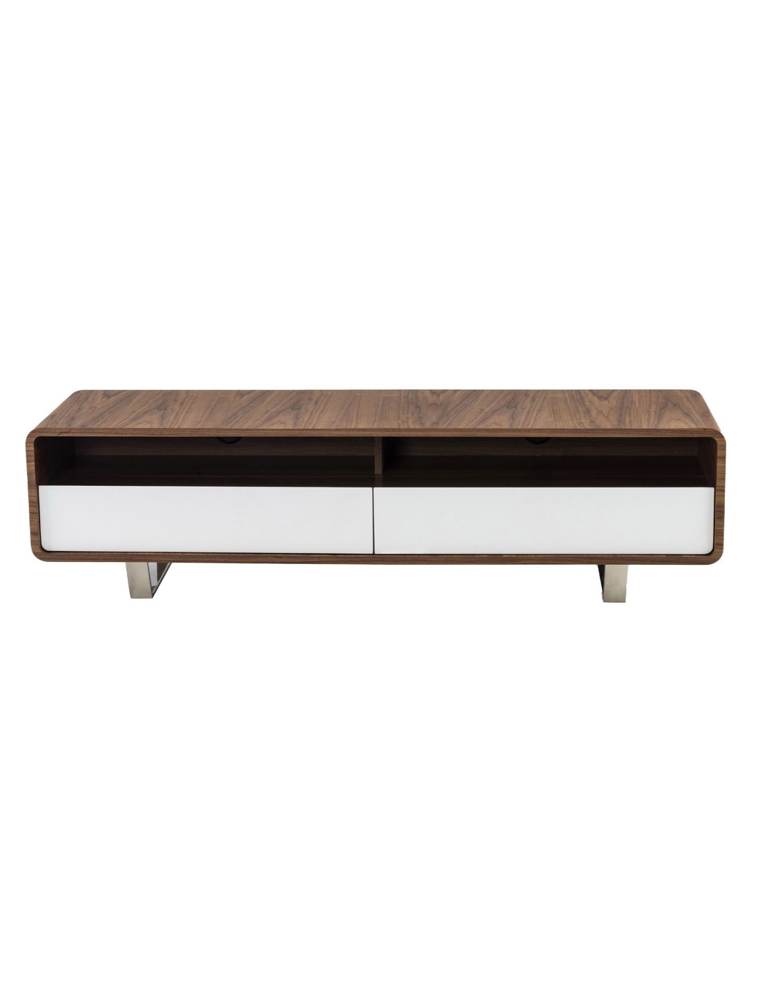 Mueble TV madera blanco, nogal y acero cromado Mueble TV de diseño moderno con estructura de madera chapada en nogal natural y unas originales patas de acero inoxidable cromado. Su original detalle en madera de MDF color blanco aporta el toque de estilo ideal para tu salón. Cuenta con un amplio espacio de almacenaje con 2 cajones con sistema de apertura uñero y cierre soft-closing. Medidas del producto: 150 x 40 x 40 cm.- Un mueble tv elegante y sofisticado de madera chapada en nogal natural de 0,5 mm de espesor con el que conseguirá el toque de modernidad y calidez que busca para su salón. - La originalidad de sus patas en acero inoxidable cromado aúnan el estilo más vanguardista de nuestra marca con la mayor calidad y diseño. - Versátil y funcional, su diseño permite que encaje en cualquier ambiente, convirtiéndose en un elemento clave de la decoración de su hogar. - Tanto por su tamaño como por su espacio de almacenaje es ideal para mantener todo en orden y en su sitio. - La madera MDF lacada en color blanco de sus cajones, brinda el toque perfecto de color a este mueble auxiliar.