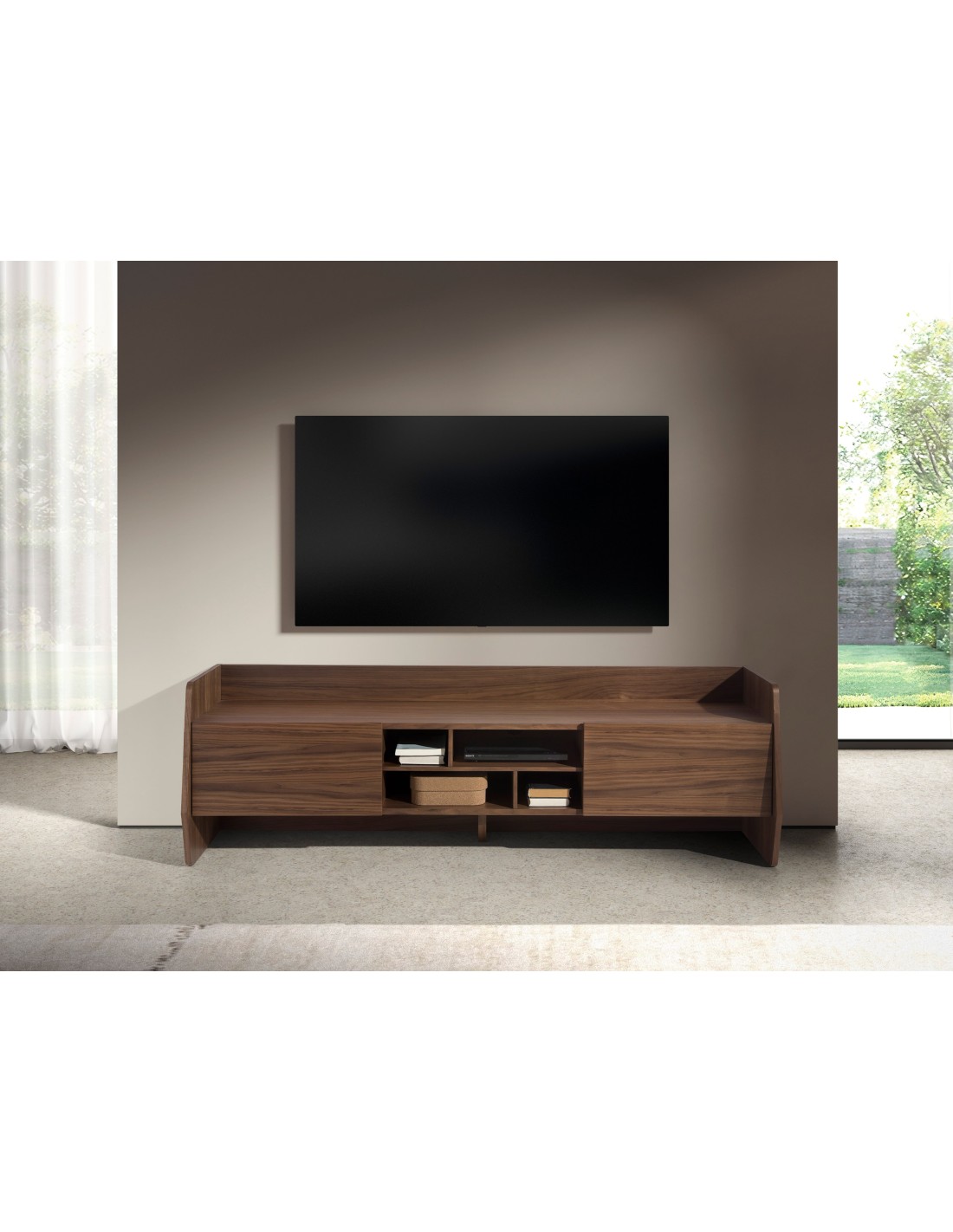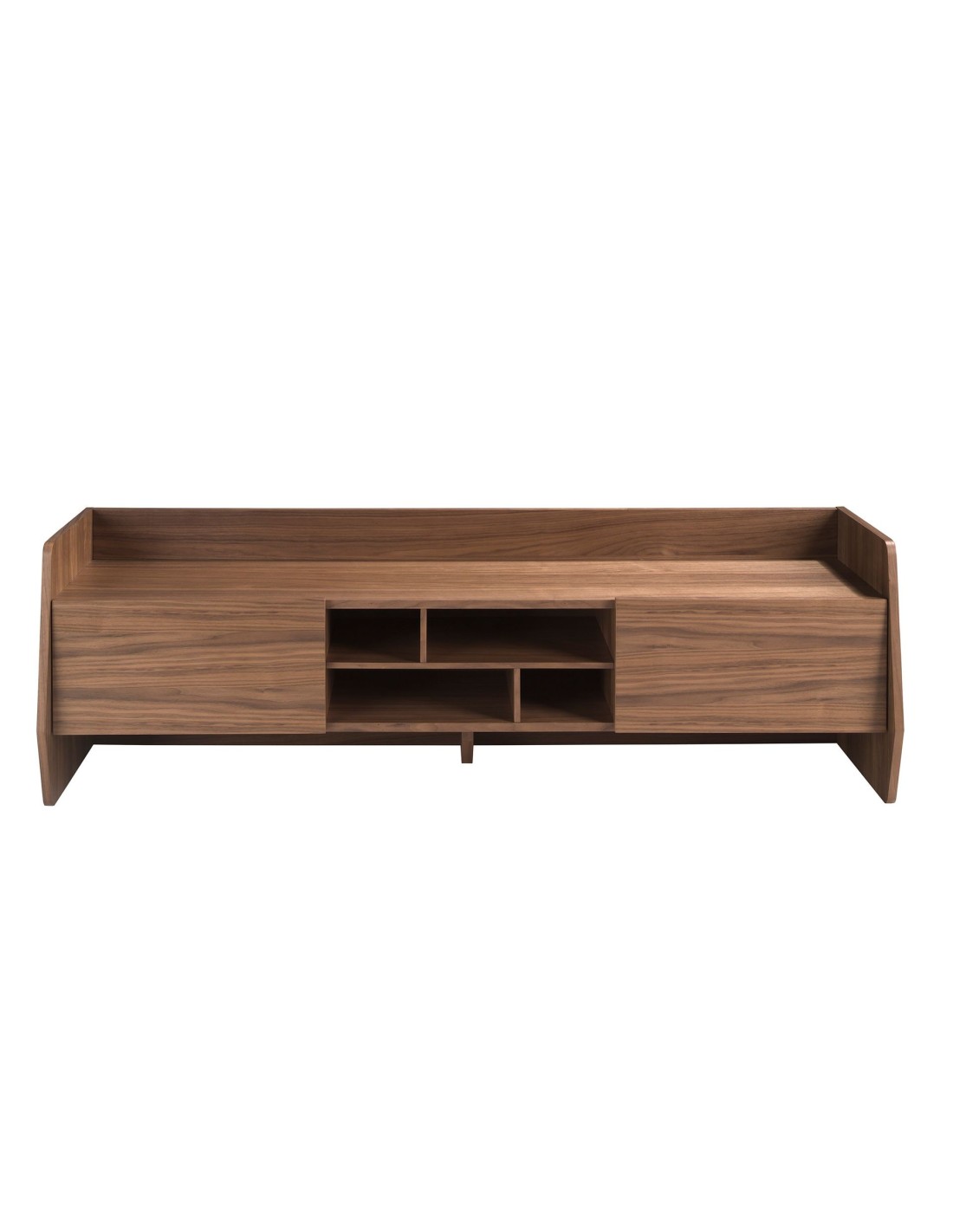 Mueble TV nogal Mueble TV de diseño moderno con estructura de madera chapada en nogal natural y unas originales patas de madera chapada en nogal natural. Cuenta con un amplio espacio de almacenaje con 2 puertas con sistema de apertura uñero y cierre soft-closing. Medidas del producto: 180 x 45 x 56 cm.- Un mueble tv elegante y sofisticado de madera chapada en nogal natural de 0,5 mm de espesor con el que conseguirá el toque de modernidad y calidez que busca para su salón. - La robusta estructura de patas de madera chapada en nogal natural aporta el toque de calidez. - Versátil y funcional, su diseño permite que encaje en cualquier ambiente, convirtiéndose en un elemento clave de la decoración de su hogar. - Tanto por su tamaño como por su gran espacio de almacenaje es ideal para mantener todo en orden y en su sitio.