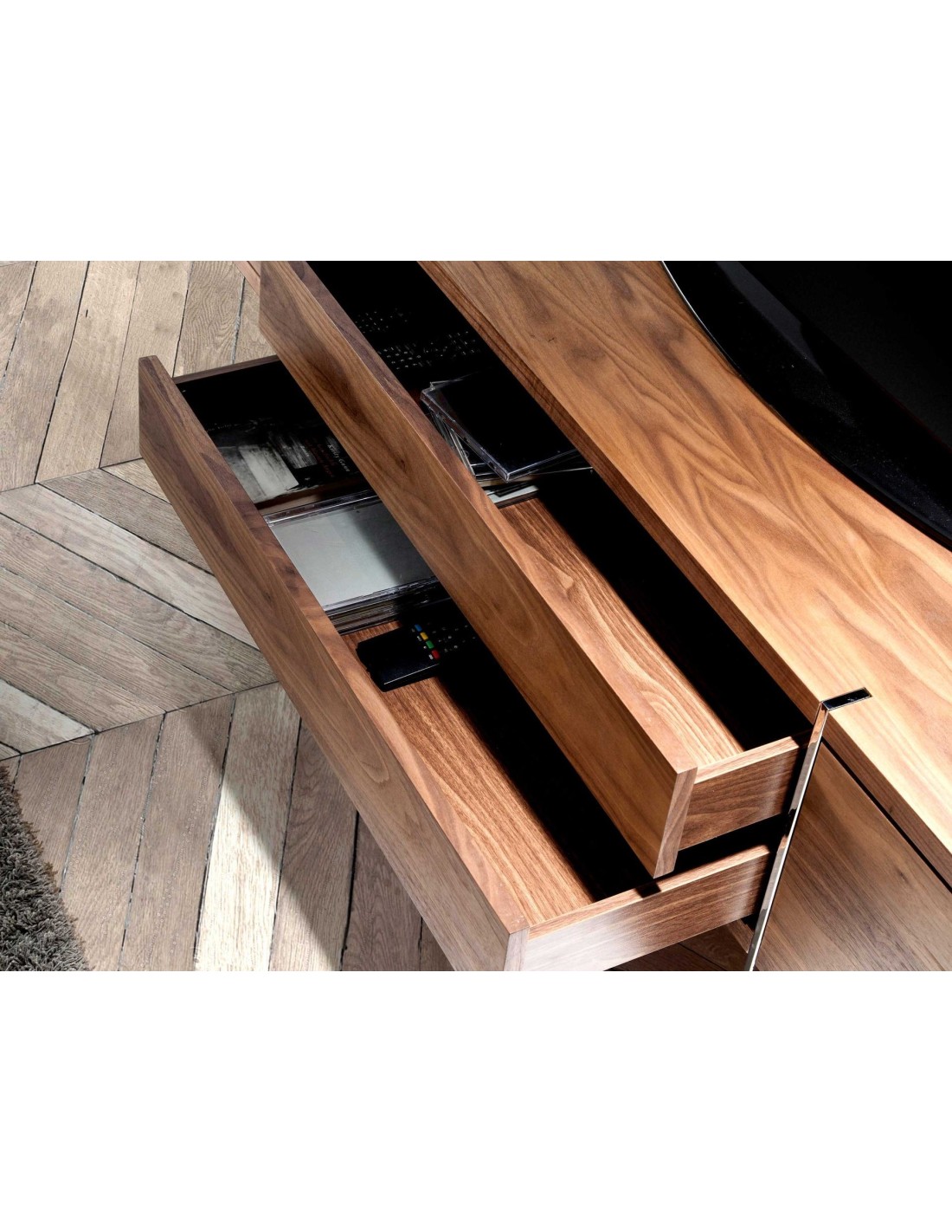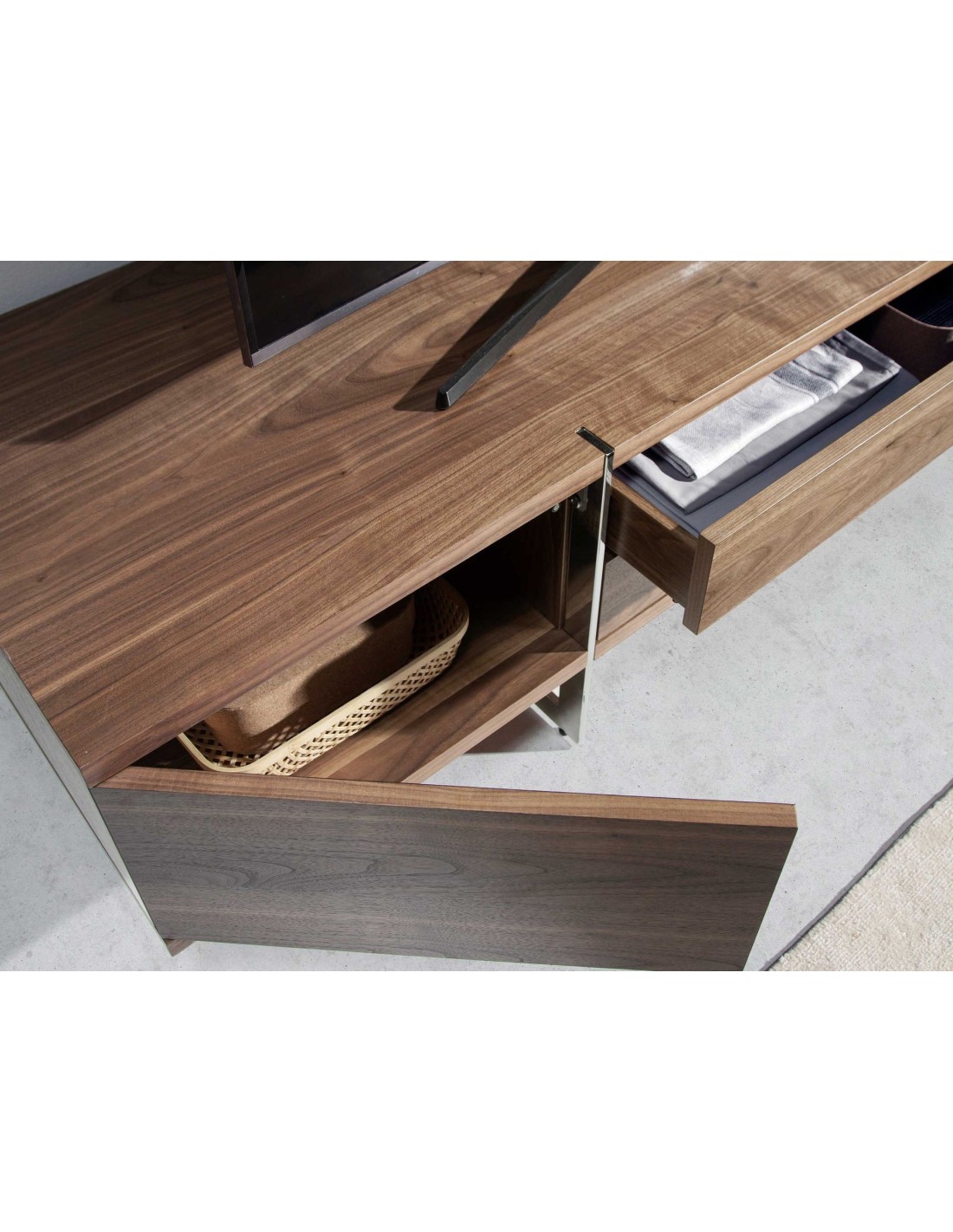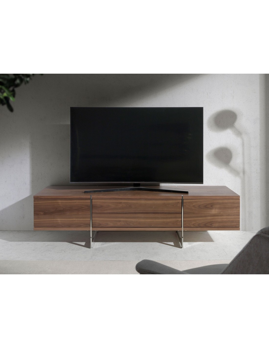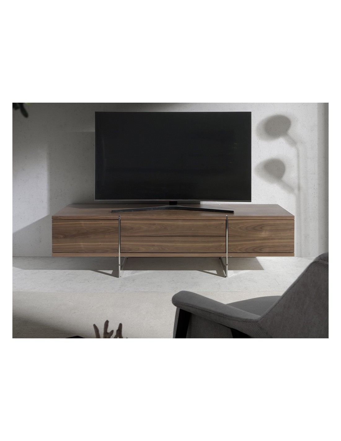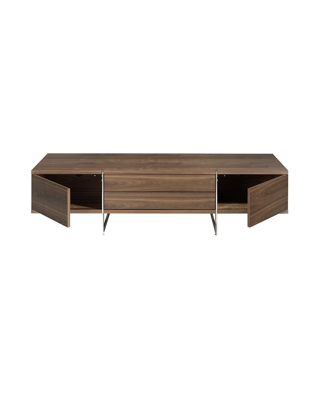 Mueble TV nogal y acero cromado Mueble TV de diseño moderno con estructura de madera chapada en nogal natural y unas originales patas de acero inoxidable cromado. Su original detalle en acero inoxidable cromado aporta el toque de estilo ideal para tu salón. Cuenta con un amplio espacio de almacenaje con 2 cajones con sistema de apertura push and pull y cierre soft-closing, y 2 puertas con sistema de apertura y cierre push and pull. Medidas del producto: 180 x 56 x 46 cm.- Un mueble tv elegante y sofisticado de madera chapada en nogal natural de 0,5 mm de espesor con el que conseguirá el toque de modernidad y calidez que busca para su salón. - La originalidad de sus patas en acero inoxidable cromado aúnan el estilo más vanguardista de nuestra marca con la mayor calidad y diseño. - Por su diseño de líneas rectas, aportará un aire de calma y calidez a cualquier estancia. - Tanto por su tamaño como por su gran espacio de almacenaje es ideal para mantener todo en orden y en su sitio.