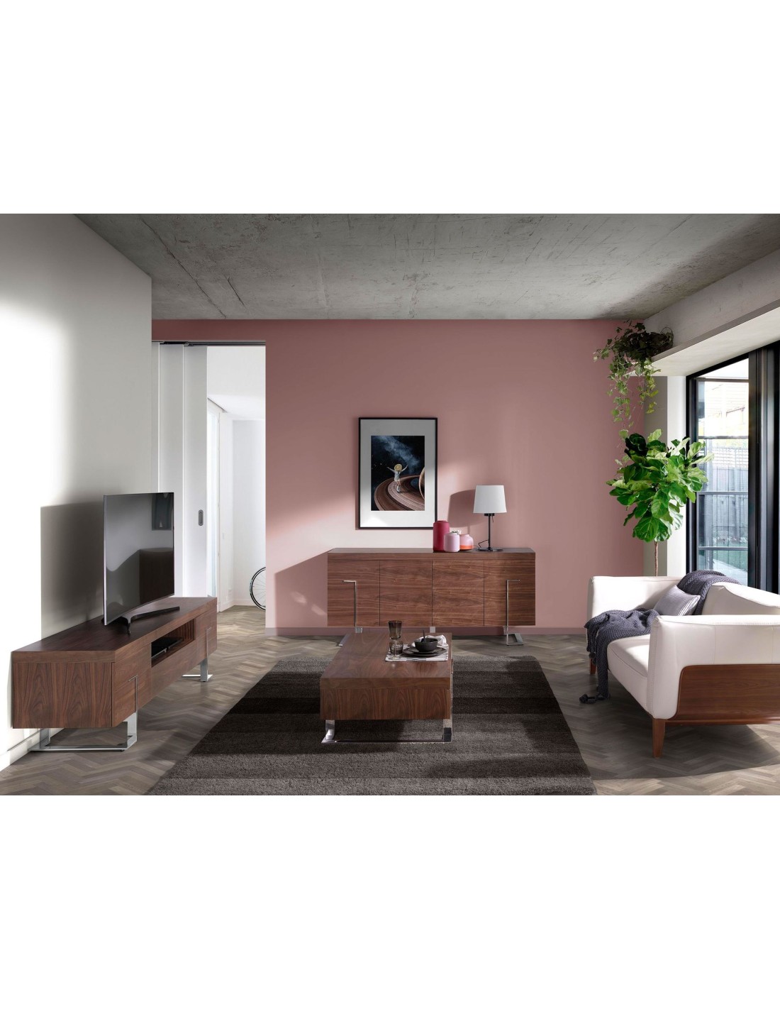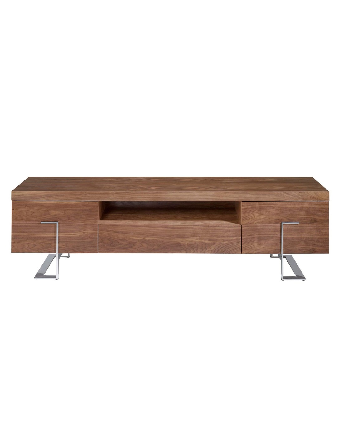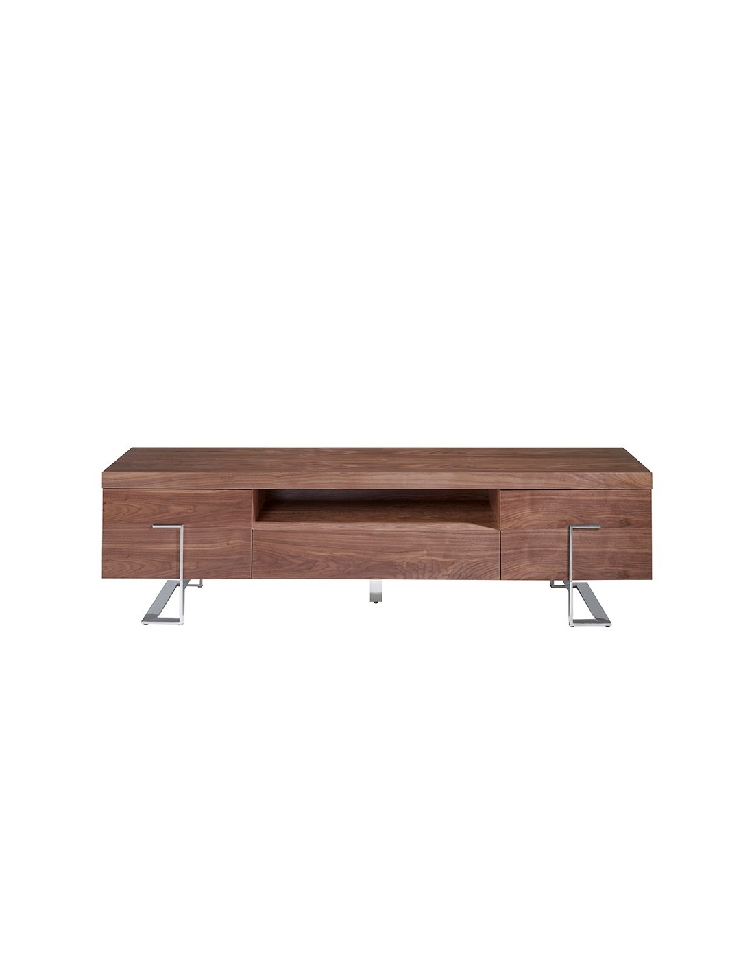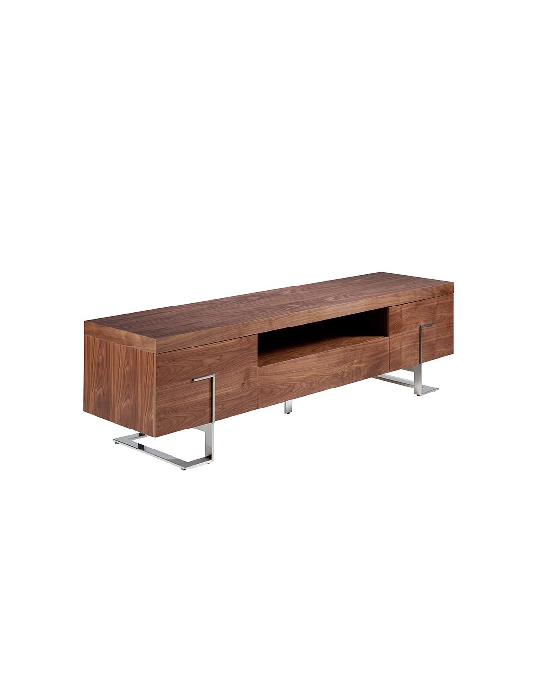 Mueble TV nogal y acero cromado Mueble TV de diseño moderno con estructura de madera chapada en nogal natural y unas originales patas de acero inoxidable cromado. Su original detalle en acero inoxidable cromado aporta el toque de estilo ideal para tu salón. Cuenta con un amplio espacio de almacenaje con 1 cajones con sistema de apertura uñero y cierre soft-closing, y 2 puertas con sistema de apertura y cierre push and pull. Medidas del producto: 200 x 51 x 56 cm.- Un mueble tv elegante y sofisticado de madera chapada en nogal natural de 0,5 mm de espesor con el que conseguirá el toque de modernidad y calidez que busca para su salón. - La originalidad de sus patas en acero inoxidable cromado aúnan el estilo más vanguardista de nuestra marca con la mayor calidad y diseño. - Por su diseño de líneas rectas, aportará un aire de calma y calidez a cualquier estancia. - Práctico y funcional, gracias a su espacio de almacenaje podrá mantener todo en su sitio, eliminando ruido visual en su salón o comedor.
