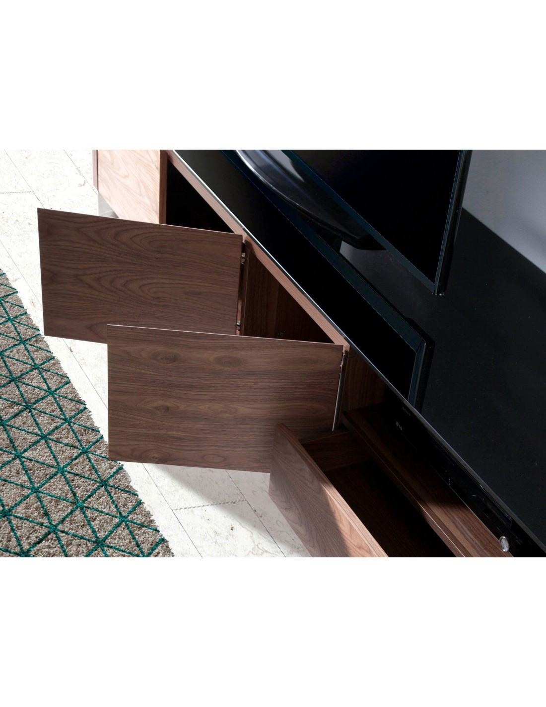 Mueble TV nogal, acero cromado y tapa de cristal negro