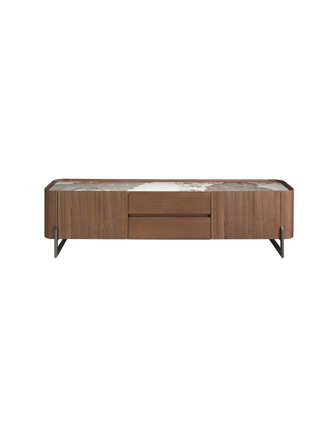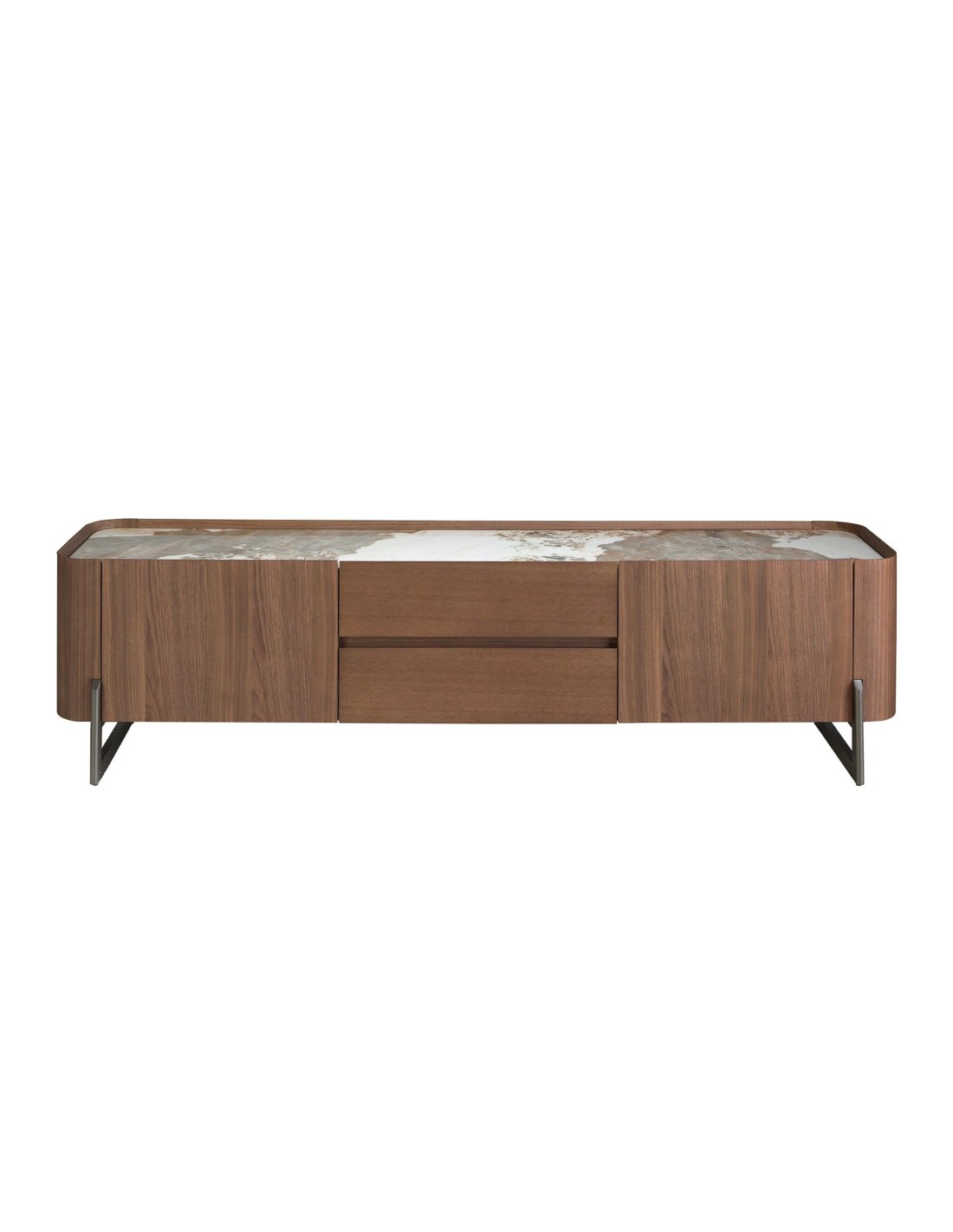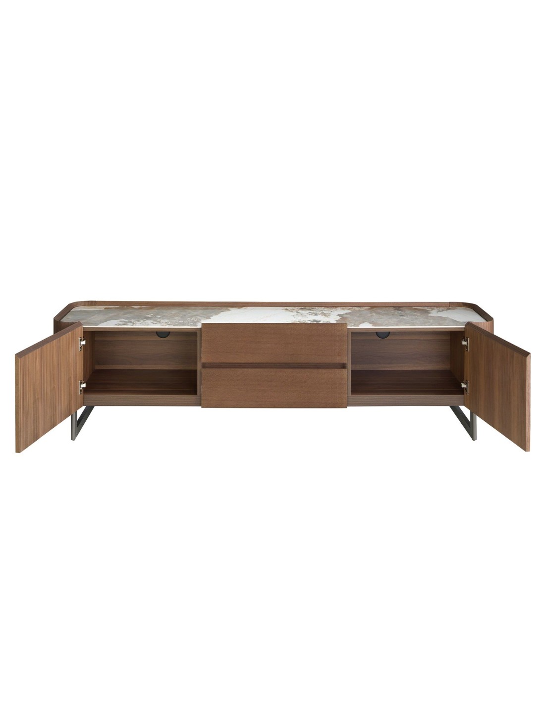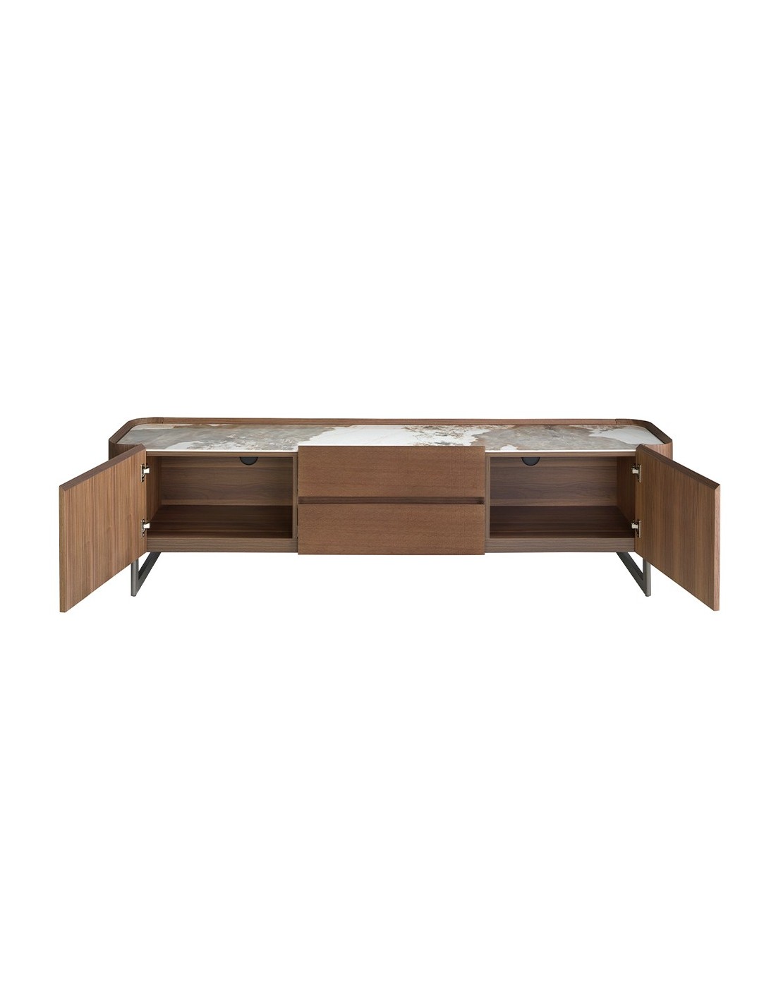 Mueble TV nogal, acero visón metal y tapa de mármol porcelánico Mueble TV de diseño moderno con estructura de madera chapada en nogal natural y unas originales patas de acero inoxidable color visón metal. Gracias a su elegante tapa de mármol porcelánico blanco con vetas en tonalidades grises y marrones en acabado brillo, conseguirá el look sofisticado que busca para sus estancias. Cuenta con un amplio espacio de almacenaje con 2 cajones con sistema de apertura uñero y cierre soft-closing, y 2 puertas con sistema de apertura uñero y cierre soft-closing. Medidas del producto: 200 x 45 x 52 cm.- Un mueble tv elegante y sofisticado de madera chapada en nogal natural de 0,5 mm de espesor con el que conseguirá el toque de modernidad y calidez que busca para su salón. - El acero de sus patas, así como su diseño lineal, permite que encaje en cualquier espacio de su hogar. - Fabricado en materiales nobles de la más alta calidad, cuenta con una tapa de mármol porcelánico blanco con un elegante diseño veteado en tonalidades tierra, lo que le confiere un diseño totalmente distintivo y de vanguardia. - Práctico y funcional, gracias a su espacio de almacenaje podrá mantener todo en su sitio, eliminando ruido visual en su salón o comedor. - El original grabado con motivos geométricos en sus cajones, lo hace todavía más especial y único.