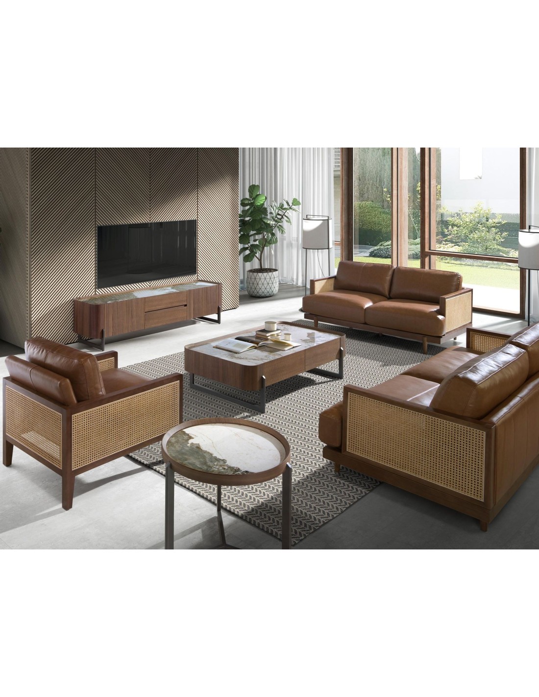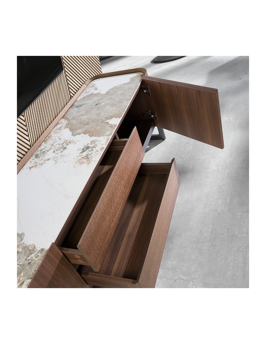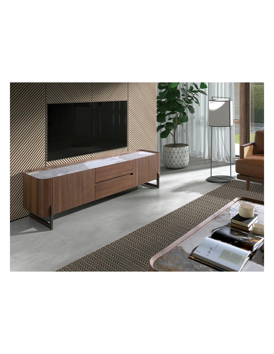 Mueble TV nogal, acero visón metal y tapa de mármol porcelánico