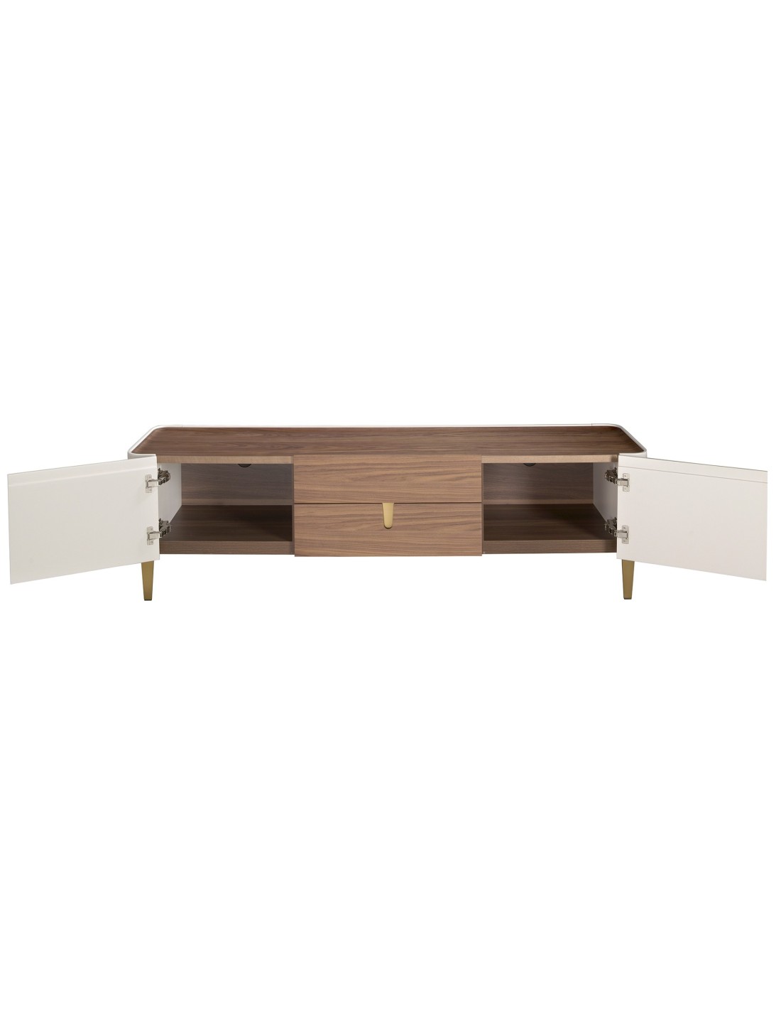 Mueble TV nogal, beige, acero pulido dorado y tapa de nogal Mueble TV de diseño moderno con estructura de madera chapada en nogal natural y madera MDF lacada en color beige, y unas originales patas de acero inoxidable pulido en color dorado. Gracias a su elegante tapa de madera chapada en nogal natural, conseguirá el look sofisticado que busca para sus estancias. Su original detalle en acero inoxidable pulido en color dorado aporta el toque de estilo ideal para tu salón. Cuenta con un amplio espacio de almacenaje con 2 cajones con sistema de apertura uñero y cierre soft-closing, y 2 puertas con sistema de apertura uñero y cierre soft-closing. Medidas del producto: 200 x 47 x 54 cm.- Un mueble tv elegante y sofisticado de madera chapada en nogal natural de 0,5 mm de espesor con el que conseguirá el toque de modernidad y calidez que busca para su salón. - El acero de sus patas, así como su diseño lineal, permite que encaje en cualquier espacio de su hogar. - Gracias a su acabado lacado, este mueble tv es ideal para crear un ambiente con carácter y personalidad, sin dejar de lado la parte más funcional y práctica para el día a día. - Práctico y funcional, gracias a su espacio de almacenaje podrá mantener todo en su sitio, eliminando ruido visual en su salón o comedor.