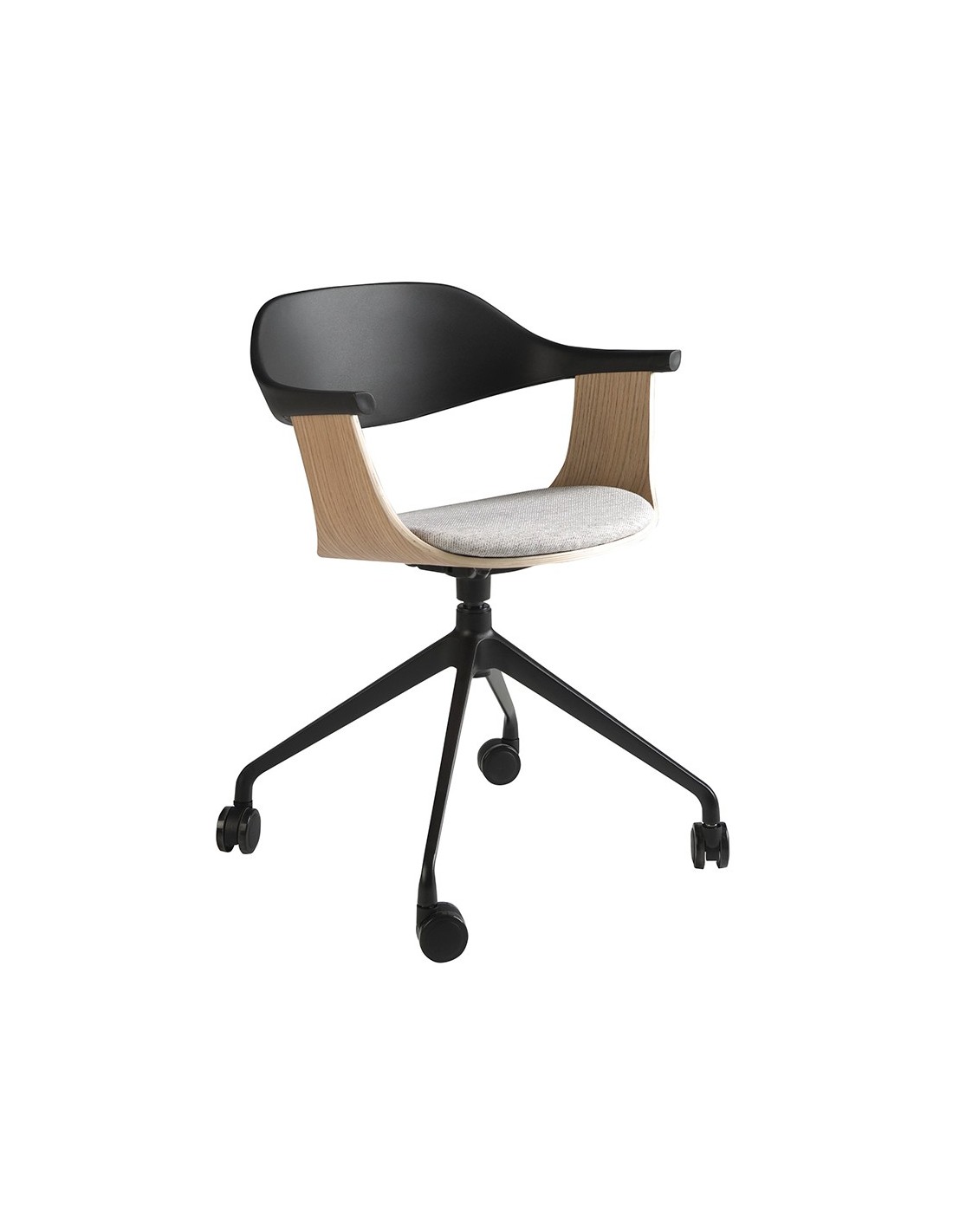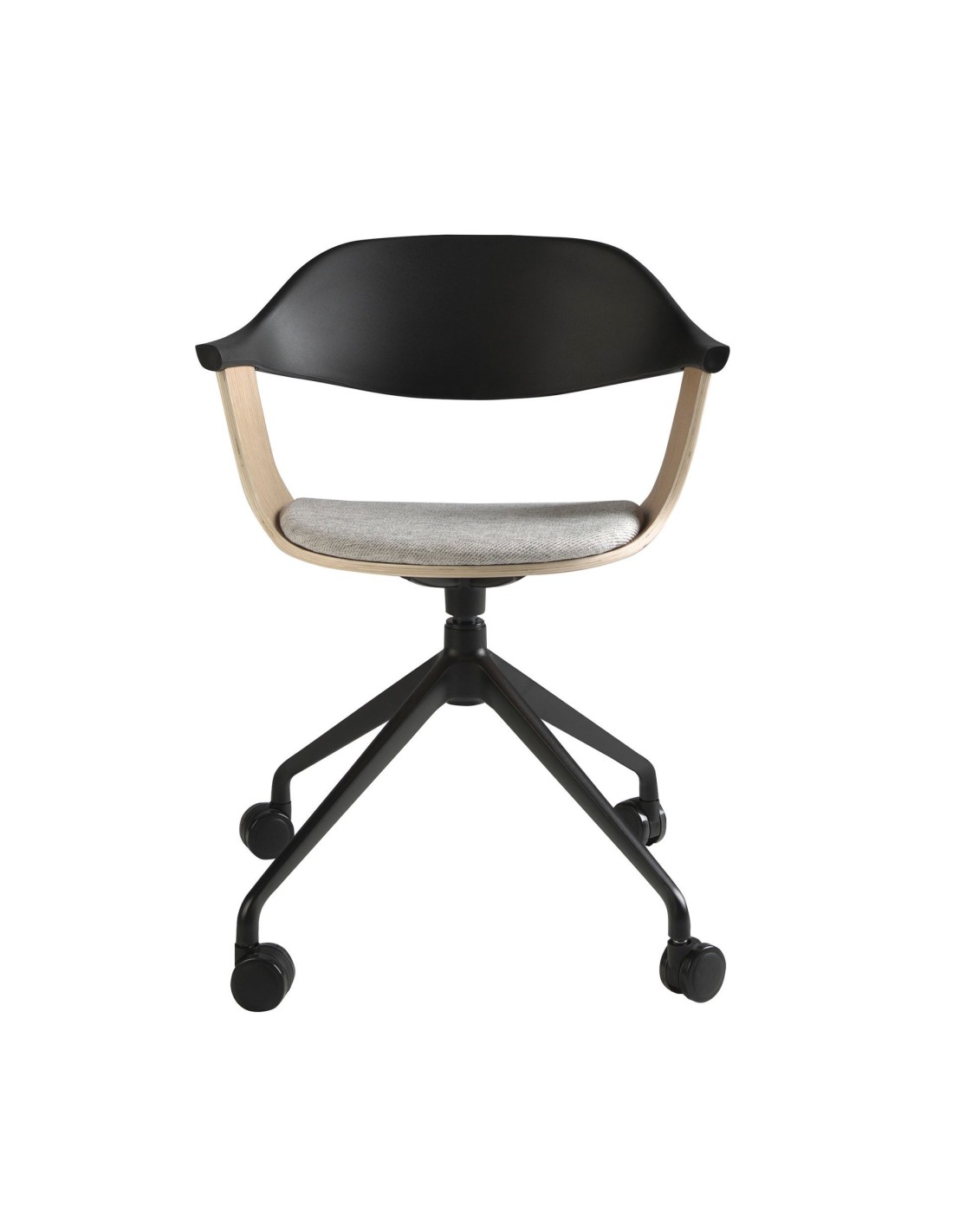 Silla oficina giratoria tela gris claro y pvc negro Silla oficina giratoria de diseño moderno con asiento tapizado en tela color gris claro y respaldo de pvc negro. Cuenta con una estructura de madera chapada en roble y reposabrazos, lo que le confiere una mayor estabilidad y comodidad. Gracias a sus patas fabricadas en acero inoxidable pintado en epoxi negro se convertirá en un imprescindible para su zona de trabajo, sin dejar de lado el estilo más vanguardista. Sus ruedas aportarán el extra de practicidad que necesita en sus horas de trabajo o estudio.Medidas del producto: 59 x 50 x 76 cm.- Su tapizado en tela le otorga, además de un carácter sofisticado, un aire mucho más cálido al espacio. - Su estructura en madera chapada en color roble le ofrece robustez, aportando además calidez y modernidad. - Esta silla de oficina cuenta con un sistema giratorio de 360º. - Tanto para trabajar desde casa como para la oficina, esta silla es la opción perfecta si lo que busca es diseño y confort.