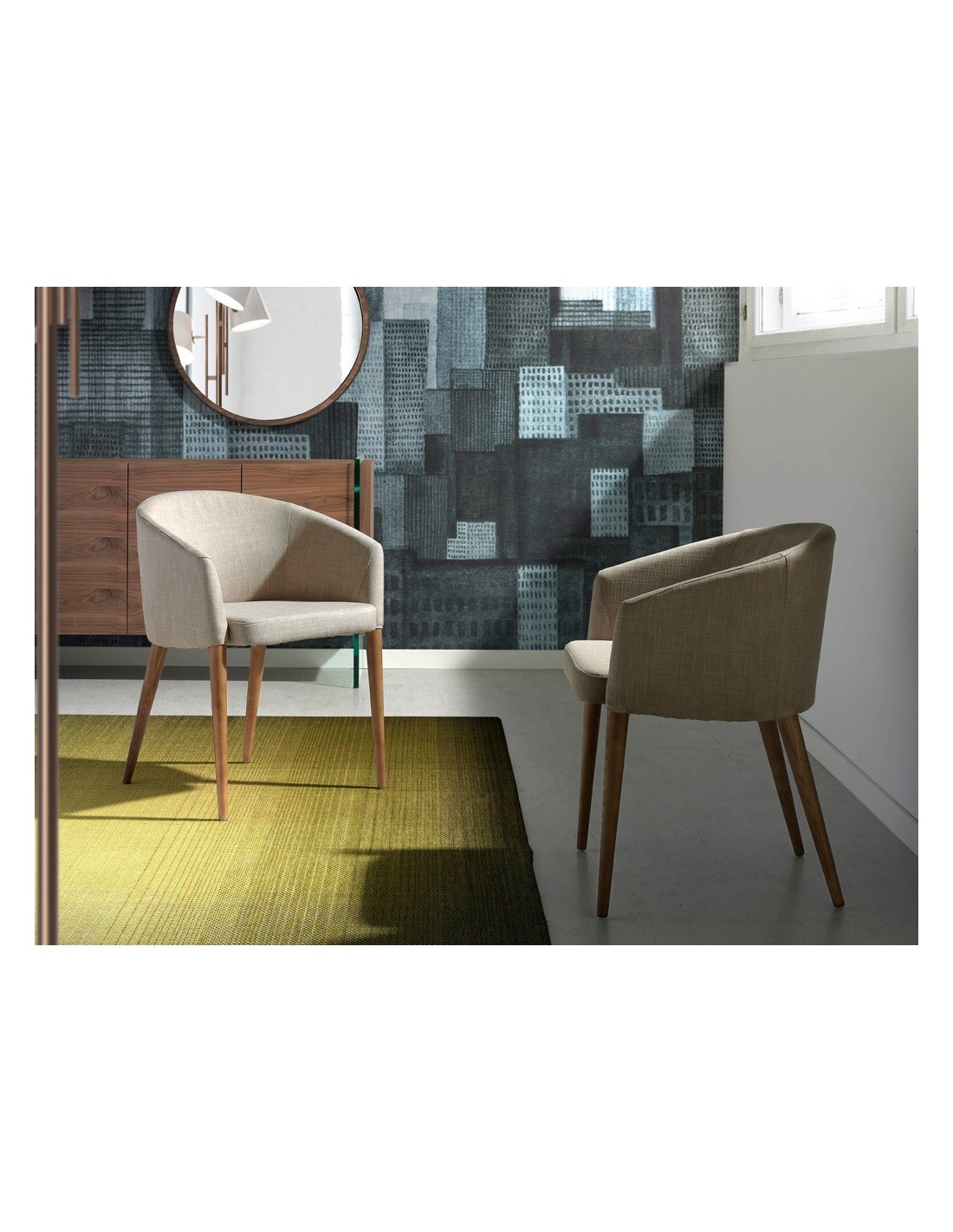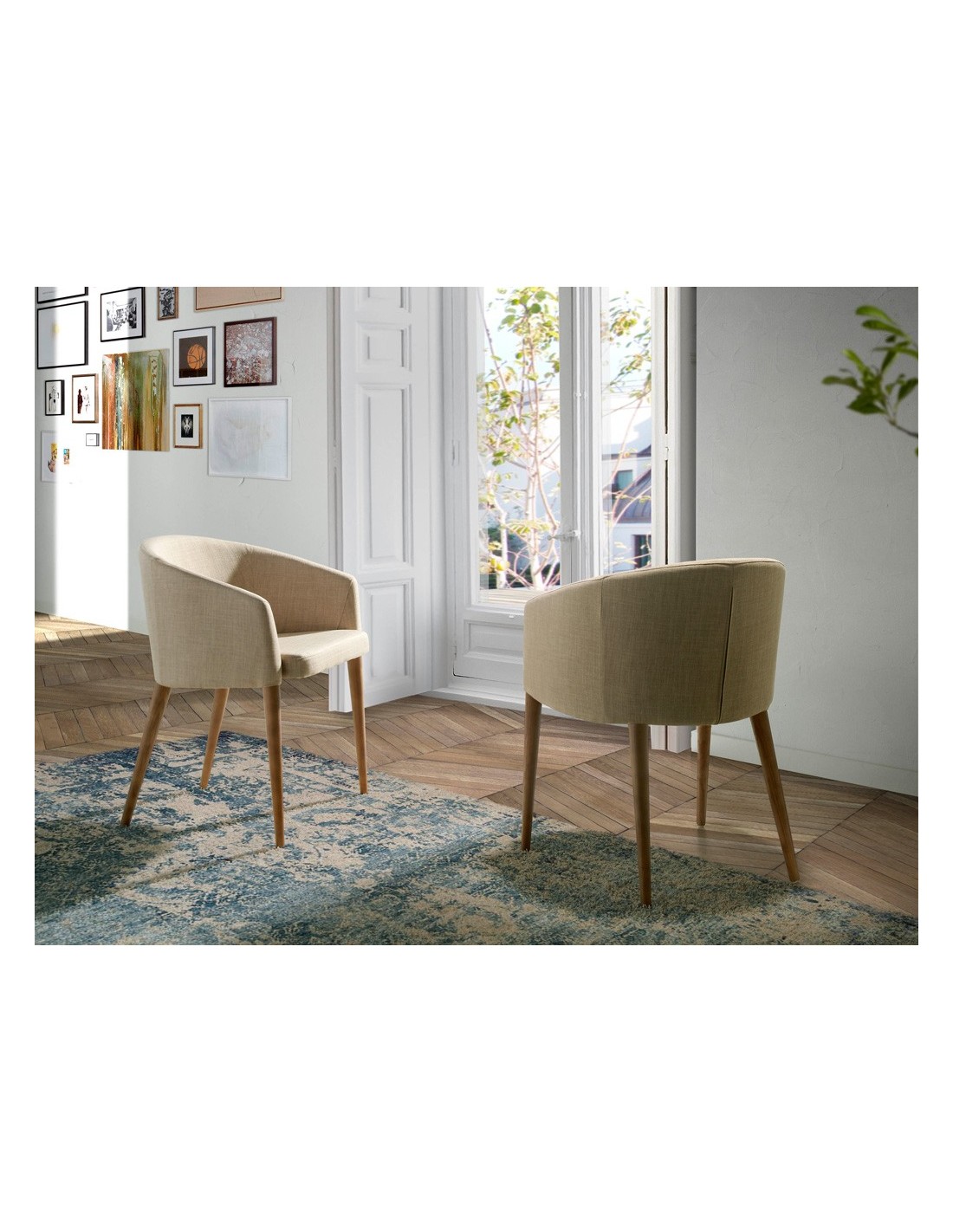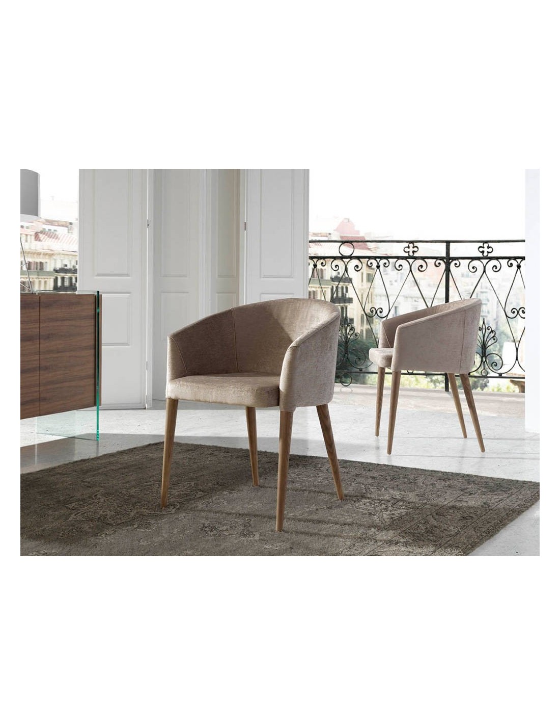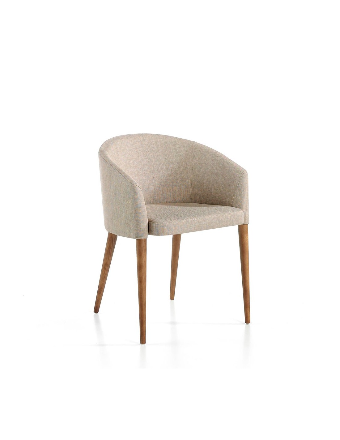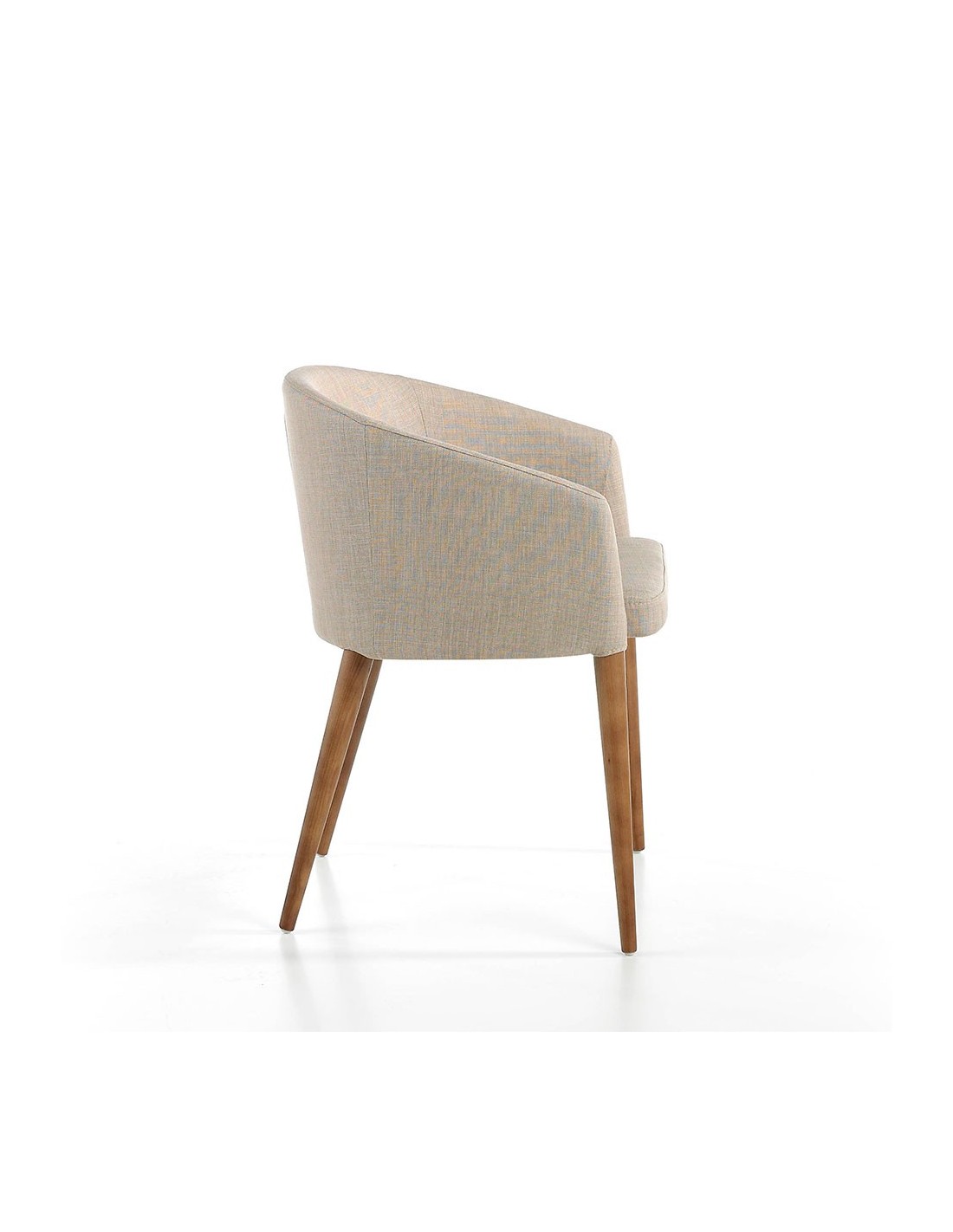Silla tela beige Silla con reposabrazos de diseño moderno con asiento y respaldo tapizados en tela color beige. Sus patas de madera en color nogal de estilo vanguardista a la vez que atemporal, la convertirán en el must have de su cocina o comedor. Esta silla de la firma Angel Cerdá, aúna el estilo único y personal de la marca, así como la mayor comodidad y estabilidad, gracias a la alta calidad de su tapizado y la original estructura de patas.Medidas del producto: 59 x 56 x 78 cm.- Gracias al tapizado en tela de esta silla de comedor, conseguirá el toque distintivo y diferente que busca para su zona de comedor. - La madera color nogal de sus patas aporta el toque de calidez y elegancia que busca para su hogar. - Su diseño versátil y funcional, la convierte en una silla ideal para cualquier tipo de salón, comedor o cocina. - El tamaño de su asiento y su relleno en espuma de poliuretano de 25kg/m3, así como su diseño de respaldo envolvente le permitirá contar con el máximo confort.