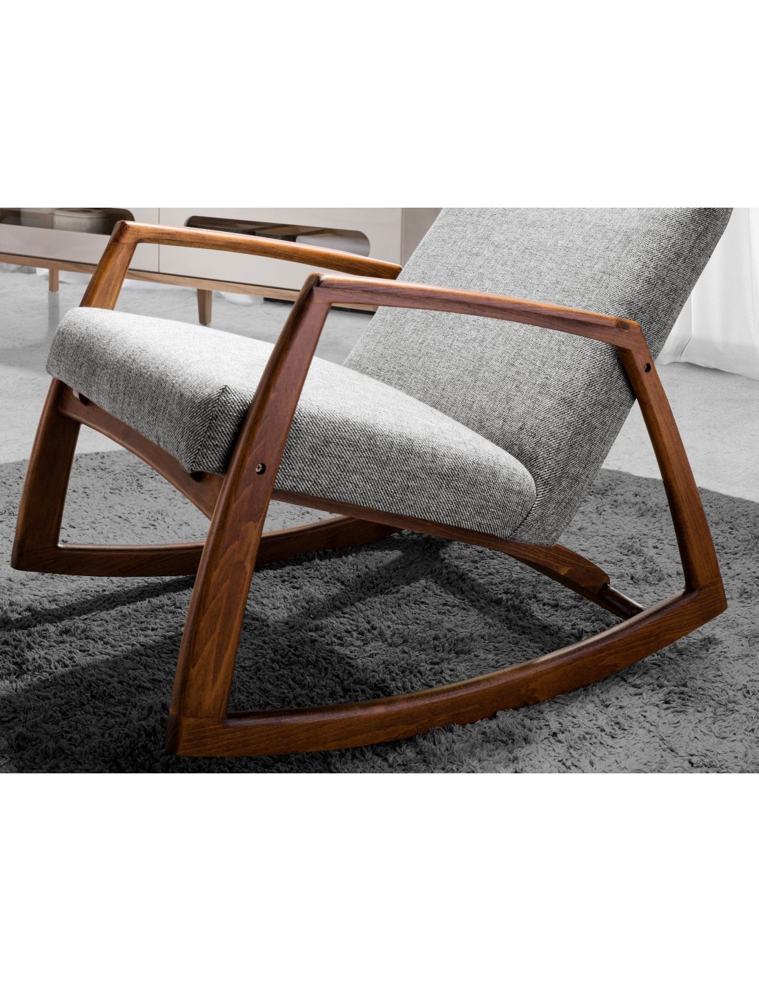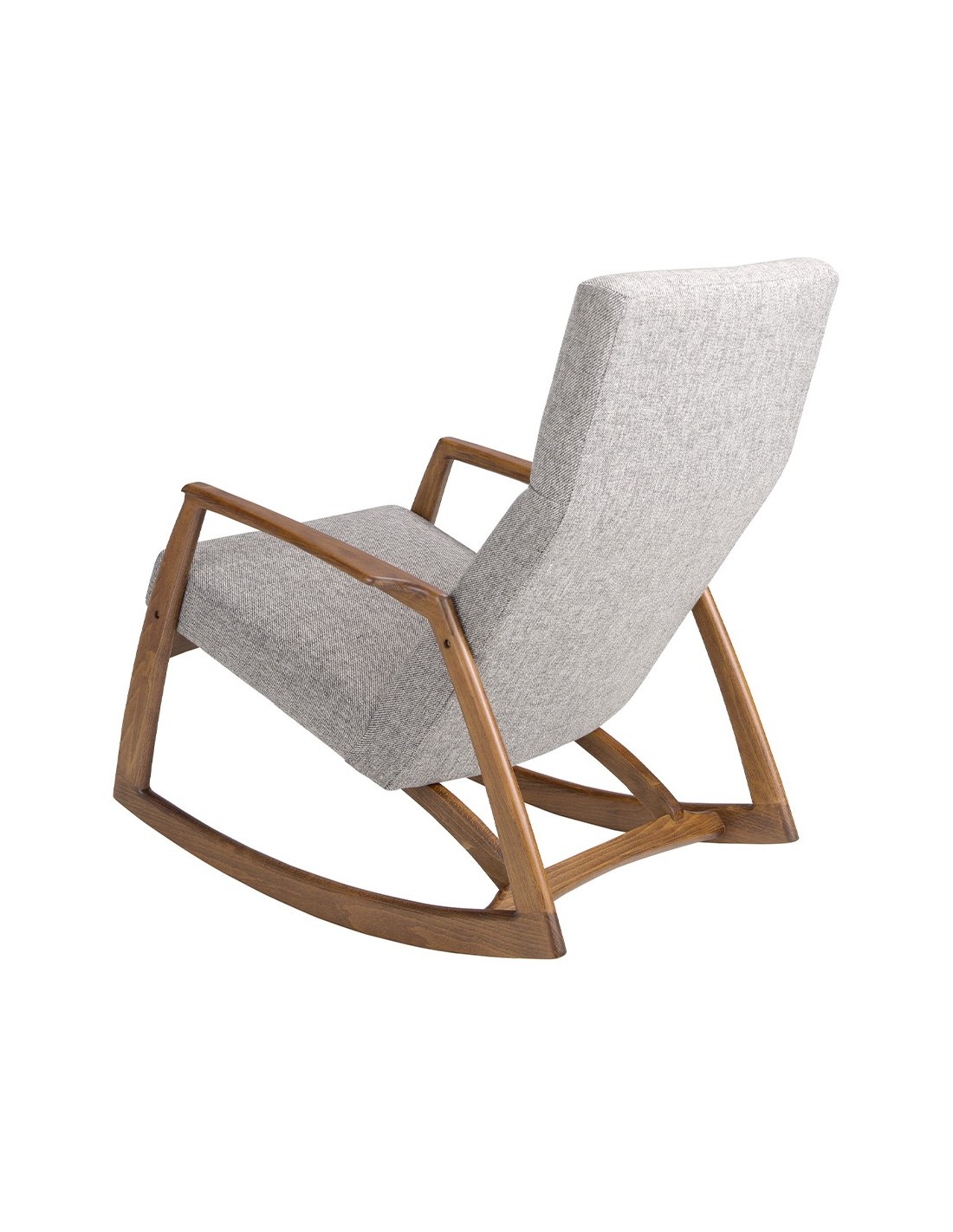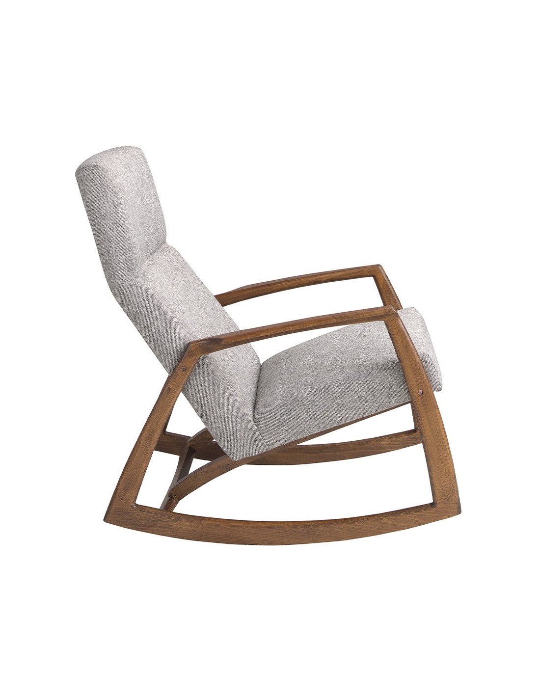 Sillón mecedora tela gris Sillón mecedora con reposabrazos de diseño moderno con asiento y respaldo tapizados en tela color gris. Tanto por su estilo, como por sus patas de madera en color nogal, este sillón mecedora es la combinación perfecta entre diseño y confort.Medidas del producto: 68 x 90 x 96 cm.- El tapizado en tela de este sillón aportará un toque único y diferente, siendo además un elemento decorativo perfecto para cualquier ambiente. - Si busca el sillón perfecto para su hogar, éste es una opción ideal que aúna el toque moderno y de vanguardia que necesita, con la mayor calidad y funcionalidad. - Fiel a las últimas tendencias en decoración, la madera de nogal aporta calidez y elegancia al ambiente. - El tamaño de su asiento relleno de espuma de poliuretano de 25kg/m3, le permitirá contar con el máximo confort, sin dejar de lado la más alta tendencia. - El diseño y la original estructura de patas de madera chapada de nogal natural de 0.5mm de espesor de este sillón mecedora es ideal para crear un ambiente relajado y repleto de elegancia. Su movimiento en balancín le permitirá disfrutar de un agradable momento de descanso.