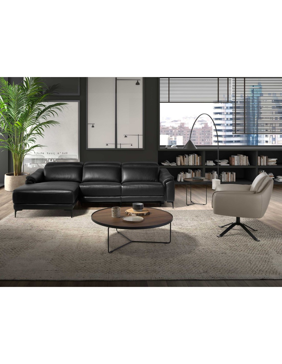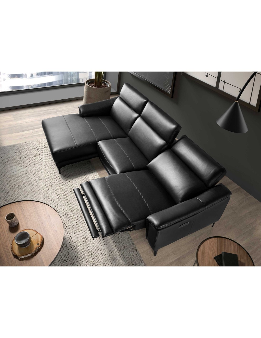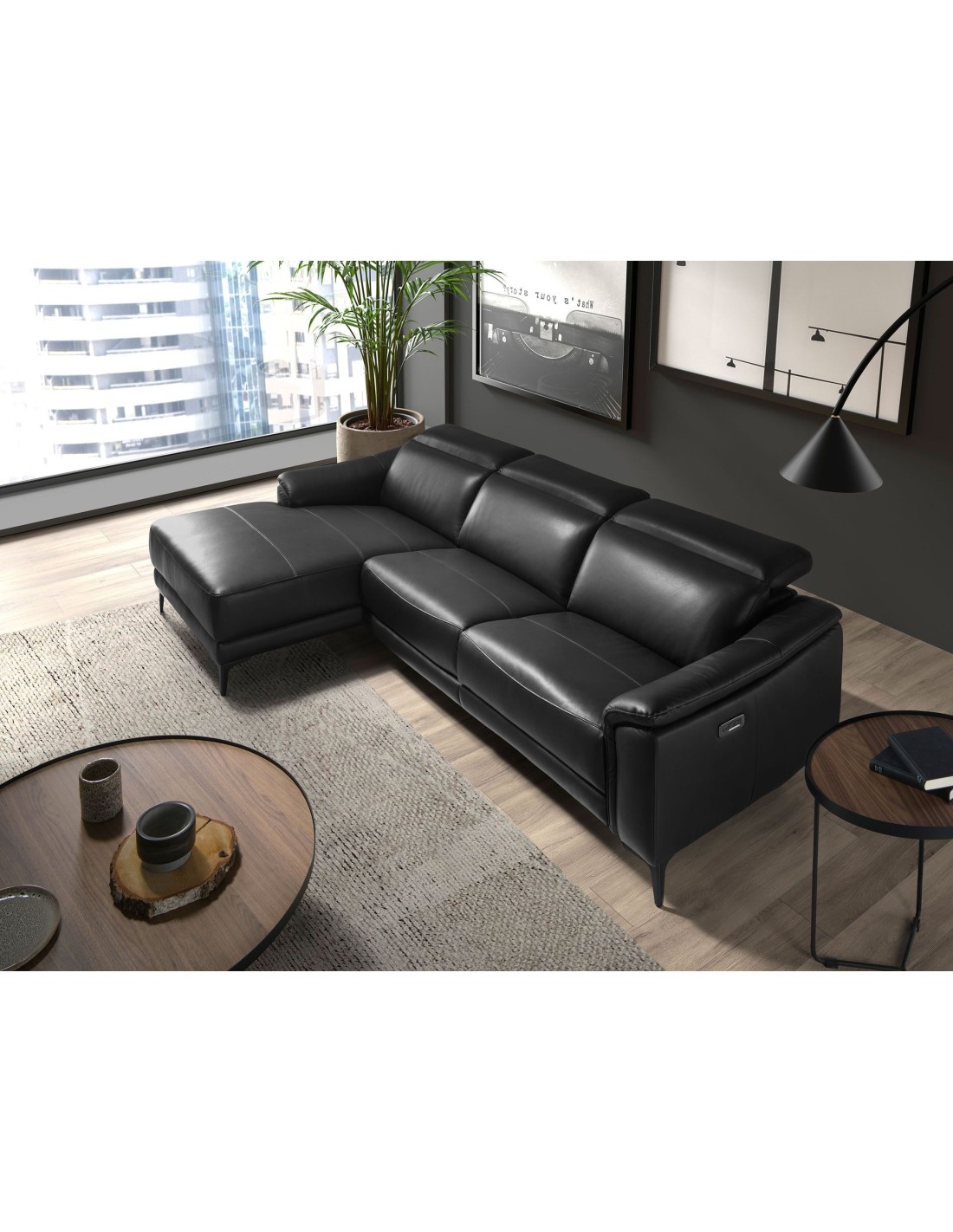 Sofá chaise longue relax izquierda piel negro Sofá chaise longue relax izquierda de 5 plazas de diseño moderno tapizado en piel de origen vacuno color negro con reposacabezas para garantizar una mayor comodidad. Tanto por su estilo, como por sus patas de acero inoxidable color negro mate, este sofá aportará el toque de vanguardia y elegancia que busca para su hogar.Su sistema de relax eléctrico, le aporta el extra de comodidad que necesita para relajarse.Medidas del producto: 272 x 168 x 96 cm.- La gran calidad de su tapizado en piel de origen vacuno de 1,5mm de espesor, le confiere además de elegancia y distinción, una gran durabilidad y comodidad. - Este sofá cuenta con sistema relax, lo que le aporta el extra de comodidad que necesita para relajarse. Su accionado con dos botones eléctricos le ofrece además, una mayor practicidad y funcionalidad, pudiendo regular de forma independiente su reposacabezas y respaldo, y reposapiés. - Sus reposacabezas articulados independientes le confieren ese extra de confort y adaptabilidad, sin dejar de lado la más alta tendencia. - Todos nuestros sofás están fabricados con materiales de la más alta calidad, con una robusta estructura interna fabricada en madera maciza de pino natural. - Cuidando hasta el más mínimo detalle, sus puertos USB y USB-C le permitirá tener cerca sus dispositivos, garantizando la combinación perfecta entre diseño y versatilidad.