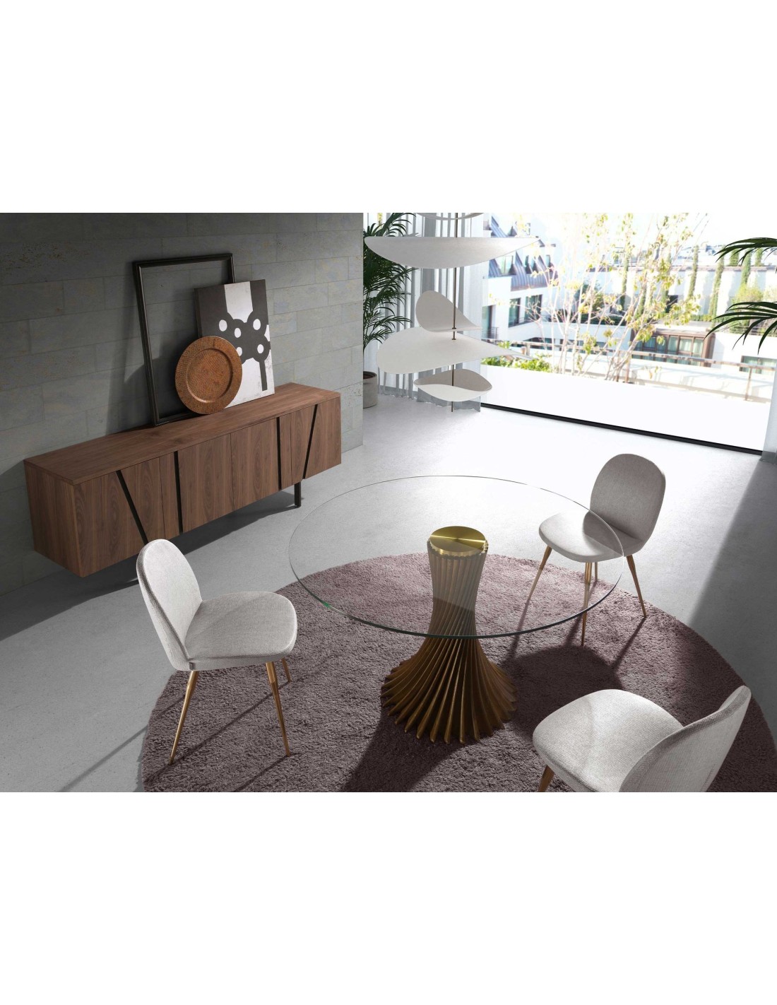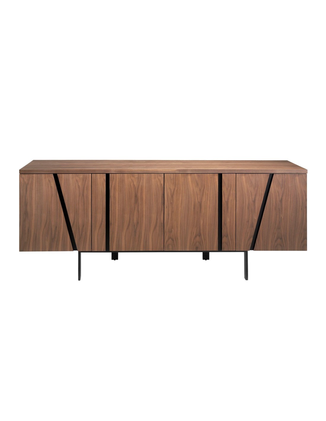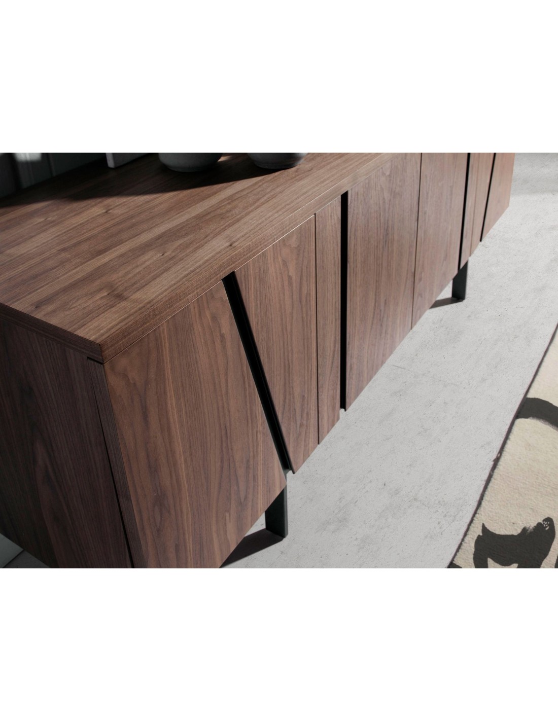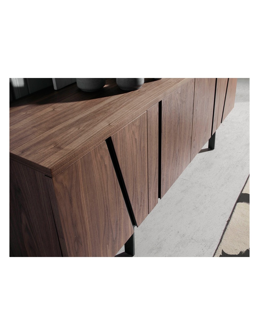 Aparador nogal y acero negro Aparador de diseño moderno con estructura de madera chapada en nogal natural y unas originales patas de acero inoxidable pintado en epoxi negro. Su original detalle en acero inoxidable pintado en epoxi negro aporta el toque de estilo ideal para tu salón. Cuenta con un amplio espacio de almacenaje con 4 puertas con sistema de apertura uñero y cierre soft-closing. Medidas del producto: 191 x 50 x 74 cm.- Este elegante aparador de madera chapada en nogal natural de 0,5 mm de espesor, aportará el toque diferente y moderno que busca para su hogar. - Fiel a las últimas tendencias en decoración, gracias a sus patas en acero negro, conseguirá un ambiente con carácter, personalidad y de diseño moderno. - Por su diseño de líneas rectas, aportará un aire de calma y calidez a cualquier estancia. - Gracias a sus baldas de madera, podrá disfrutar de un amplio espacio para guardar su vajilla o menaje de mesa. - Si lo que busca es un hogar tranquilo y relajado, este mueble auxiliar le ayudará a mantener el orden gracias a su gran espacio de almacenaje.