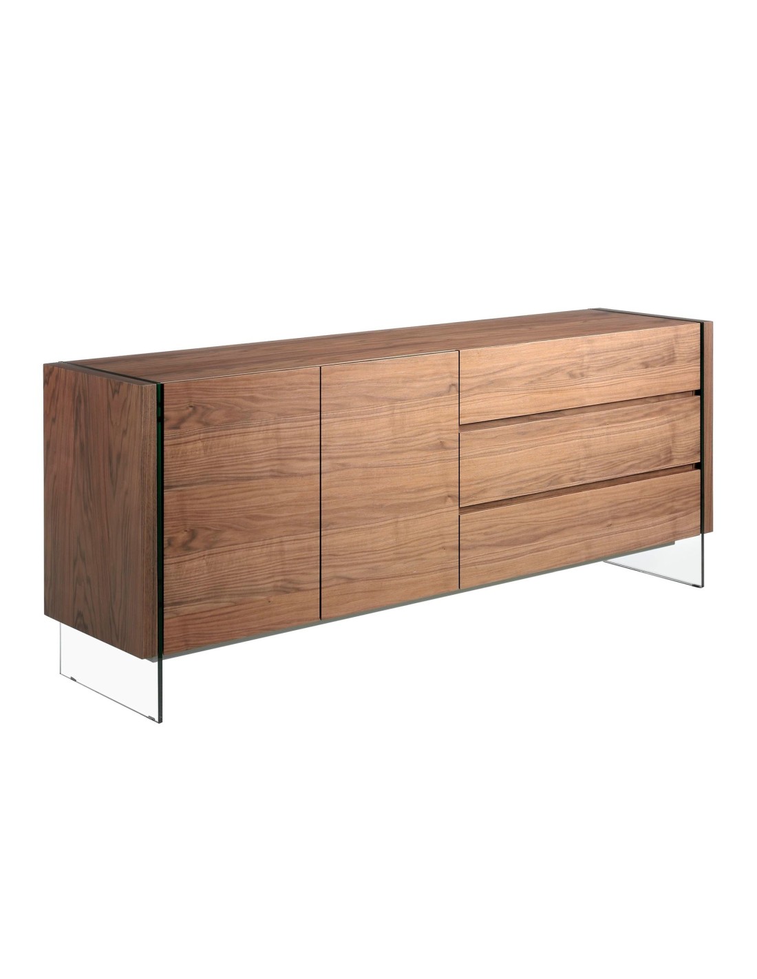 Aparador nogal y cristal templado Aparador de diseño moderno con estructura de madera chapada en nogal natural y unas originales patas de cristal templado. Cuenta con un amplio espacio de almacenaje con 3 cajones con sistema de apertura uñero y cierre soft-closing, y 2 puertas con sistema de apertura uñero y cierre soft-closing. Medidas del producto: 188 x 45 x 75 cm.- Un aparador elegante y sofisticado de madera chapada en nogal natural de 0,5 mm de espesor con el que conseguirá el toque de modernidad y calidez que busca para su salón o comedor. - El acabado de sus patas en cristal templado creará una mayor sensación de luminosidad, a la vez que de mayor calidez. - Por su diseño de líneas rectas, aportará un aire de calma y calidez a cualquier estancia. - Gracias a sus baldas de madera, podrá disfrutar de un amplio espacio para guardar su vajilla o menaje de mesa. - Si lo que busca es un hogar tranquilo y relajado, este mueble auxiliar le ayudará a mantener el orden gracias a su gran espacio de almacenaje.