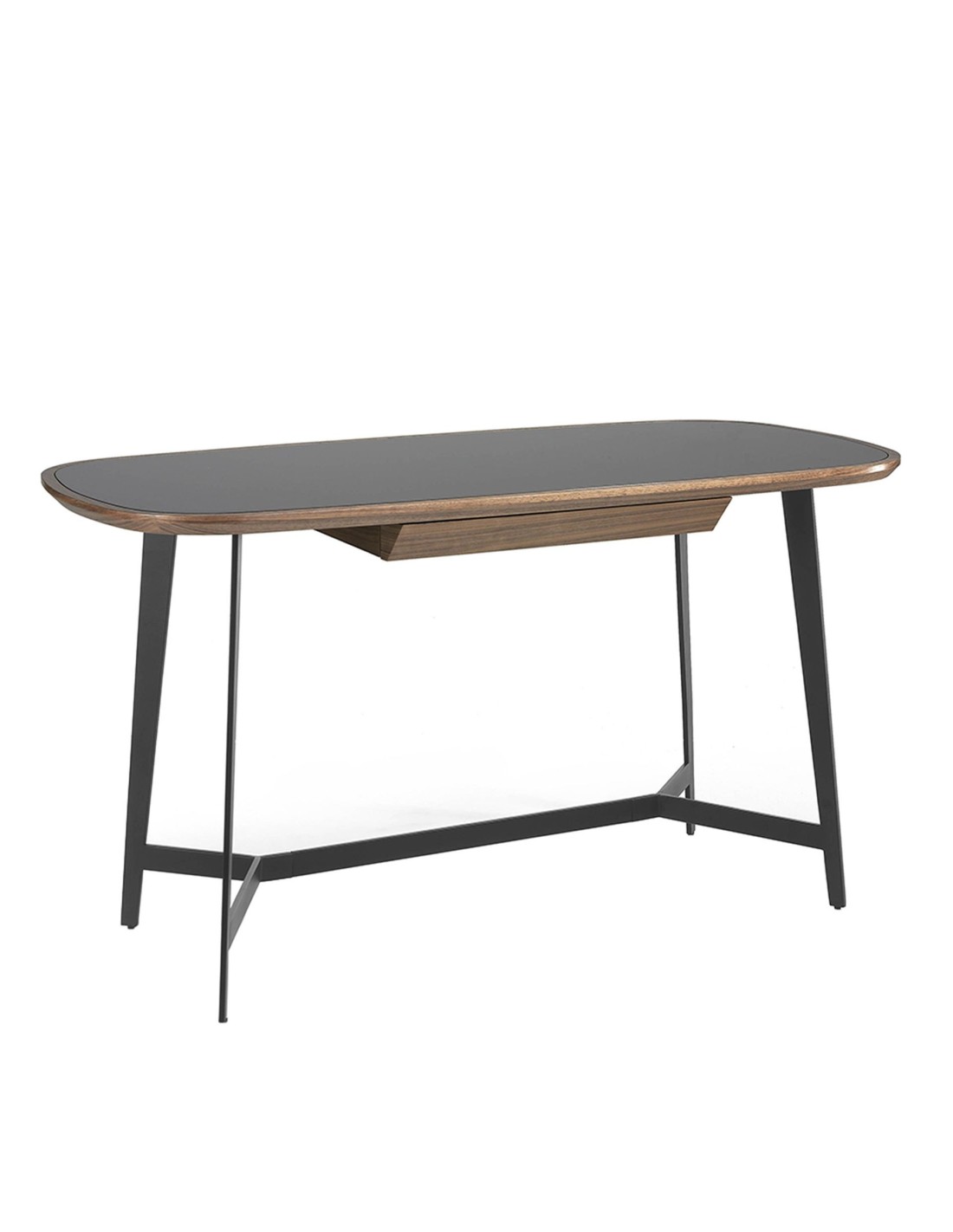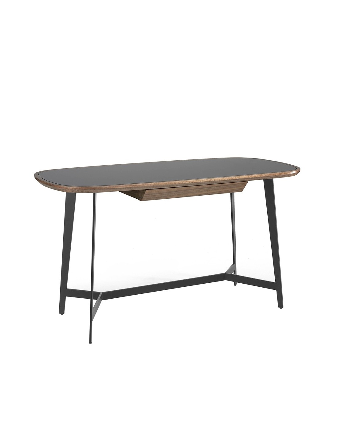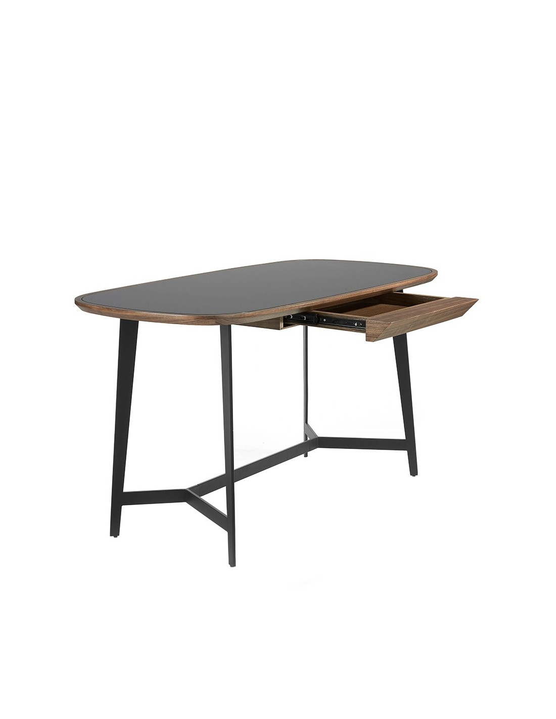 Escritorio nogal y acero negro con tapa de cristal negro