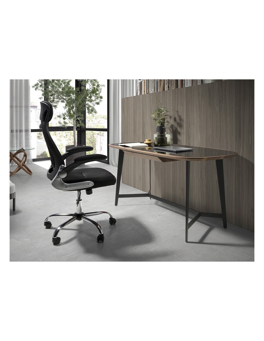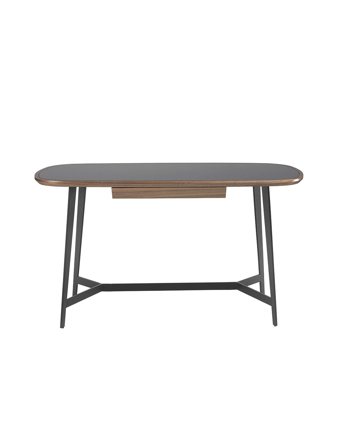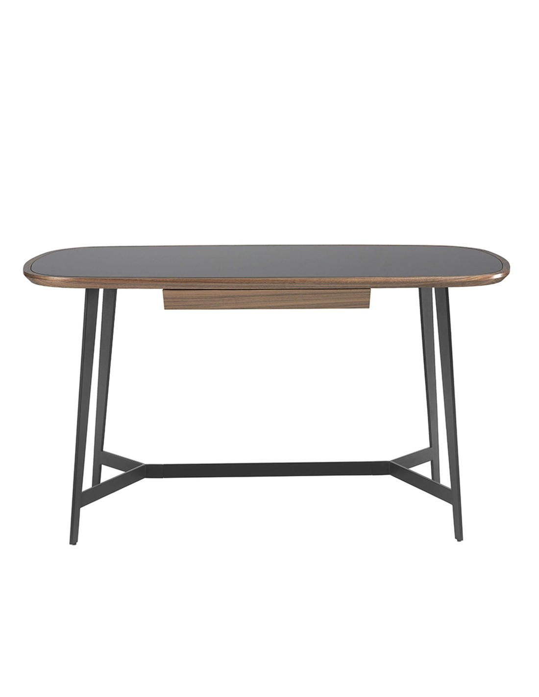 Escritorio nogal y acero negro con tapa de cristal negro