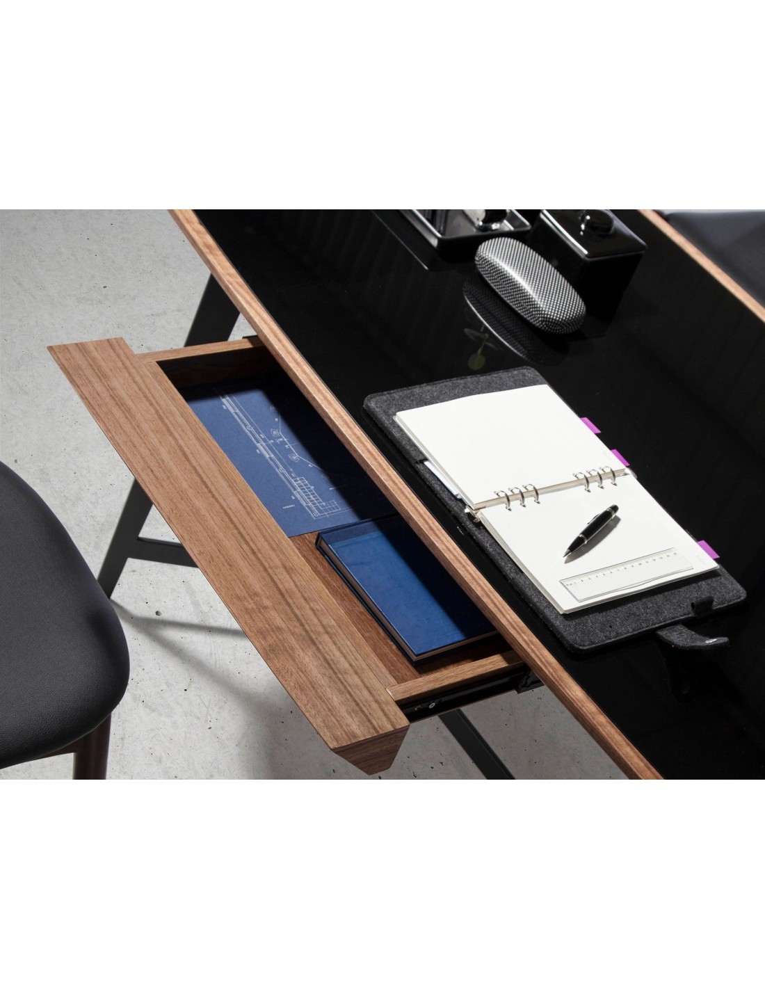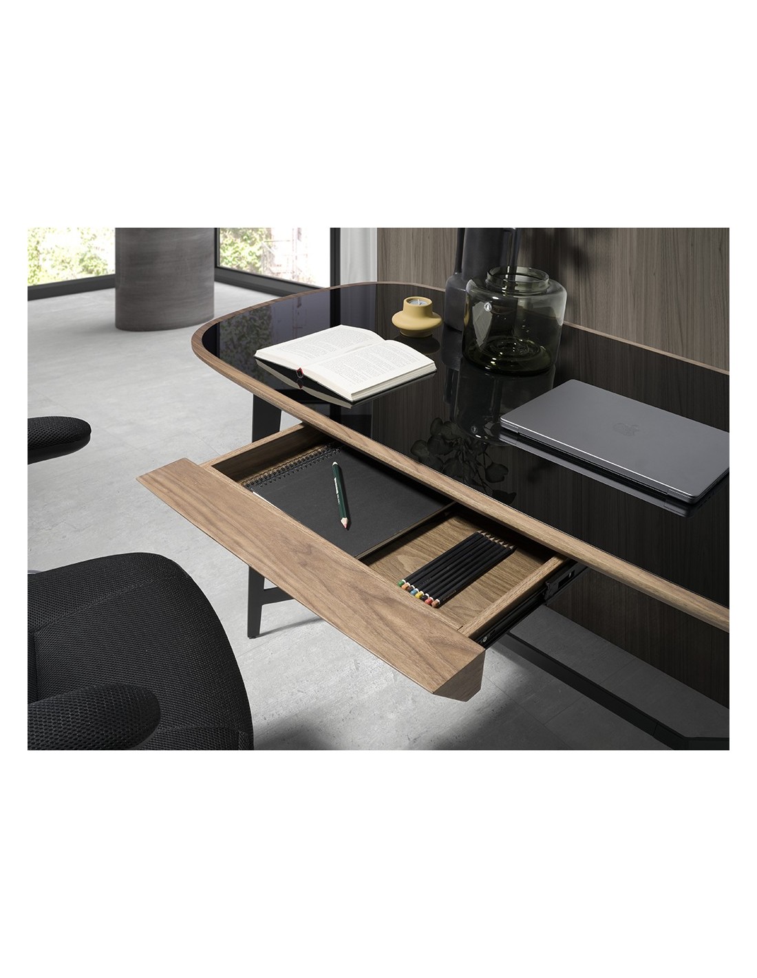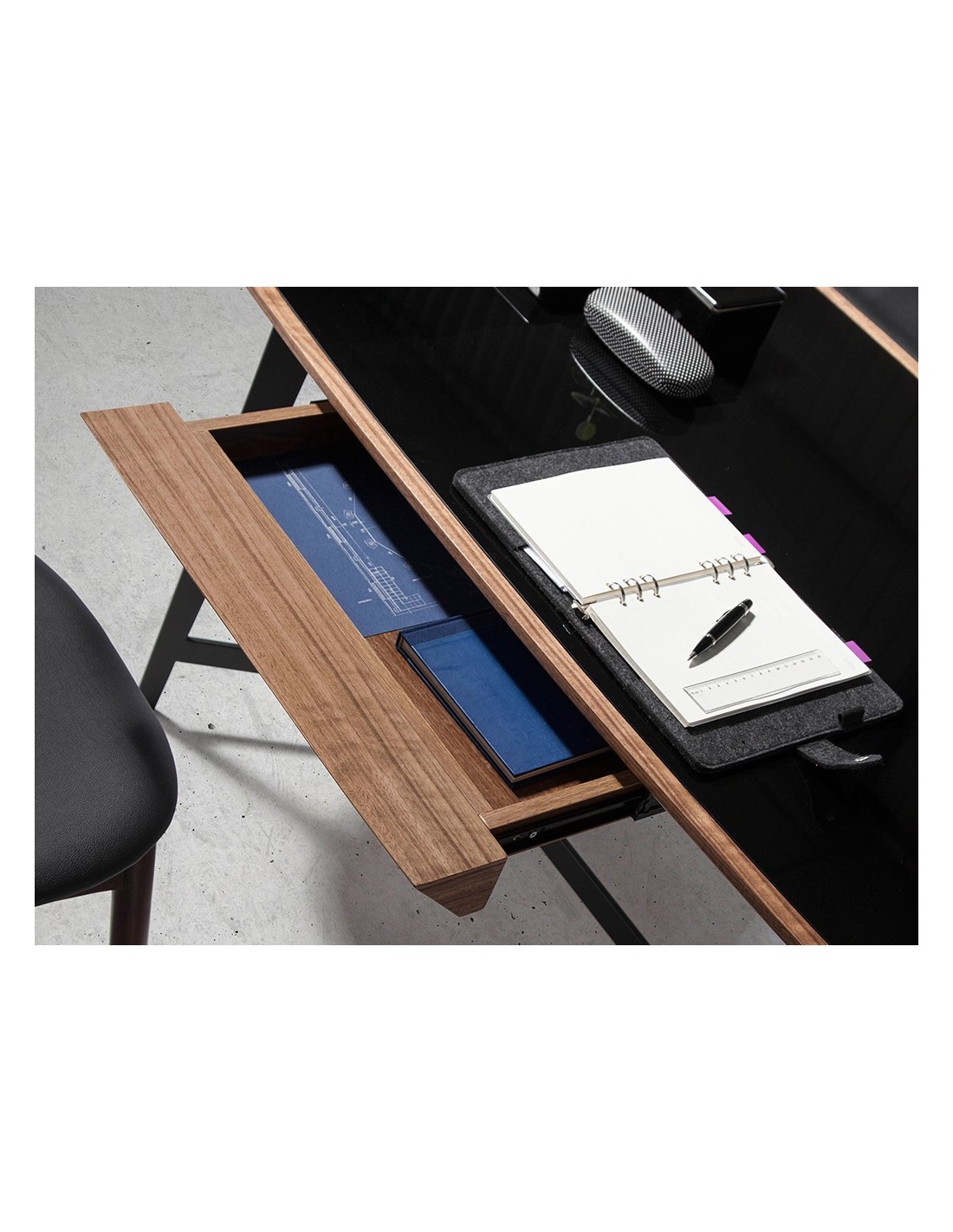 Escritorio nogal y acero negro con tapa de cristal negro Escritorio de diseño moderno con tapa de cristal templado tintado en color negro y estructura de madera chapada en nogal natural. El diseño de sus patas de acero inoxidable pintado en epoxi negro aportará un toque sofisticado y exclusivo a su estancia. Gracias a su amplio espacio de almacenaje con 1 cajón con sistema de apertura uñero y cierre soft-closing, le permitirá mantener todo en orden y en su sitio. Medidas del producto: 140 x 72 x 76 cm.- Tanto por su diseño como por su tapa de cristal templado color negro, este escritorio aportará amplitud y elegancia a su oficina, convirtiéndolo en una pieza clave en la decoración de su zona de trabajo. - Fiel a las últimas tendencias en decoración, el acero negro le permitirá crear un espacio único, personal y con carácter. - Todos nuestros productos están fabricados con materiales de la más alta calidad, siendo además un elemento versátil y funcional para su zona de trabajo o vestidor. - Gracias a su cajón central, cuenta con espacio de almacenaje para poder guardar todo lo que necesite tener a mano para su día a día, manteniendo así el orden visual en la habitación.