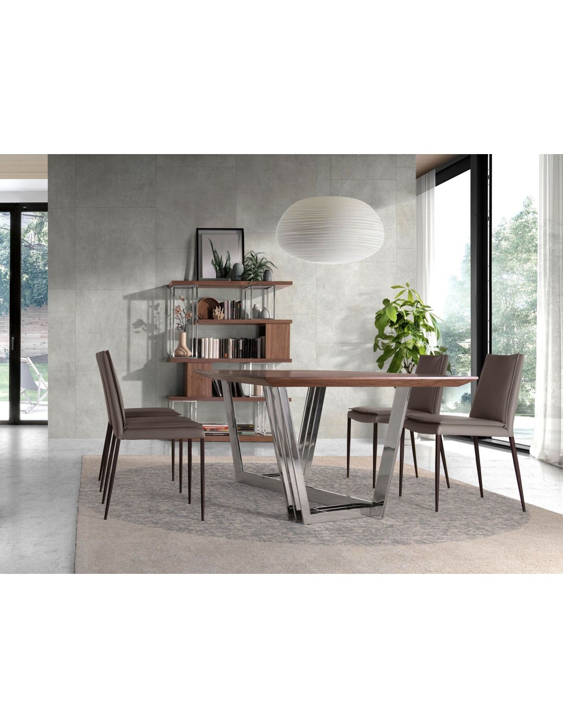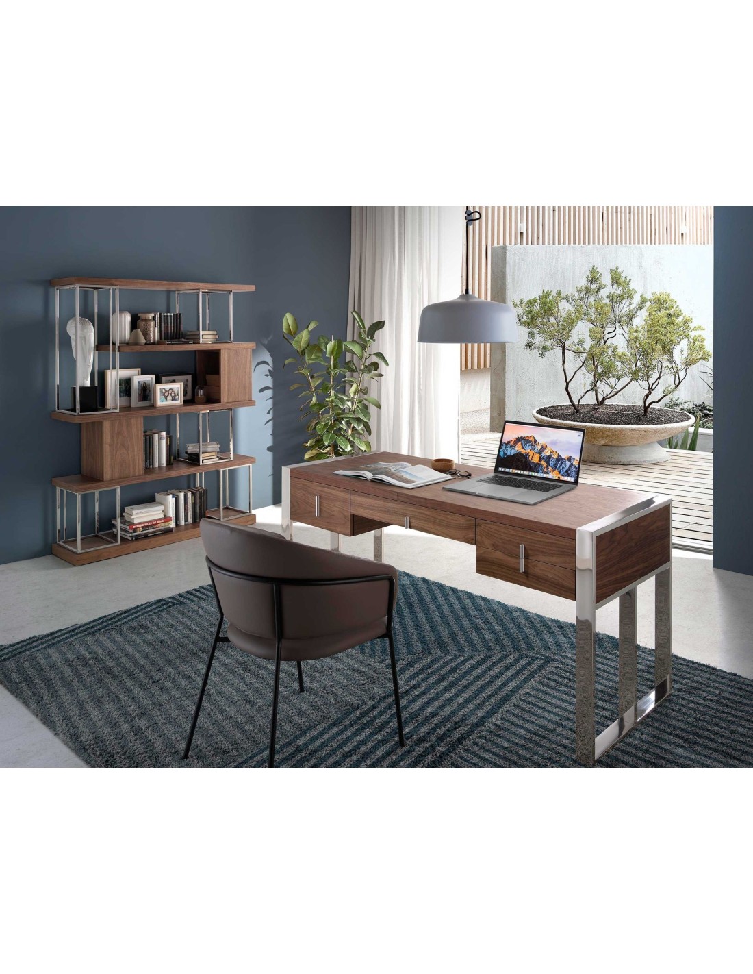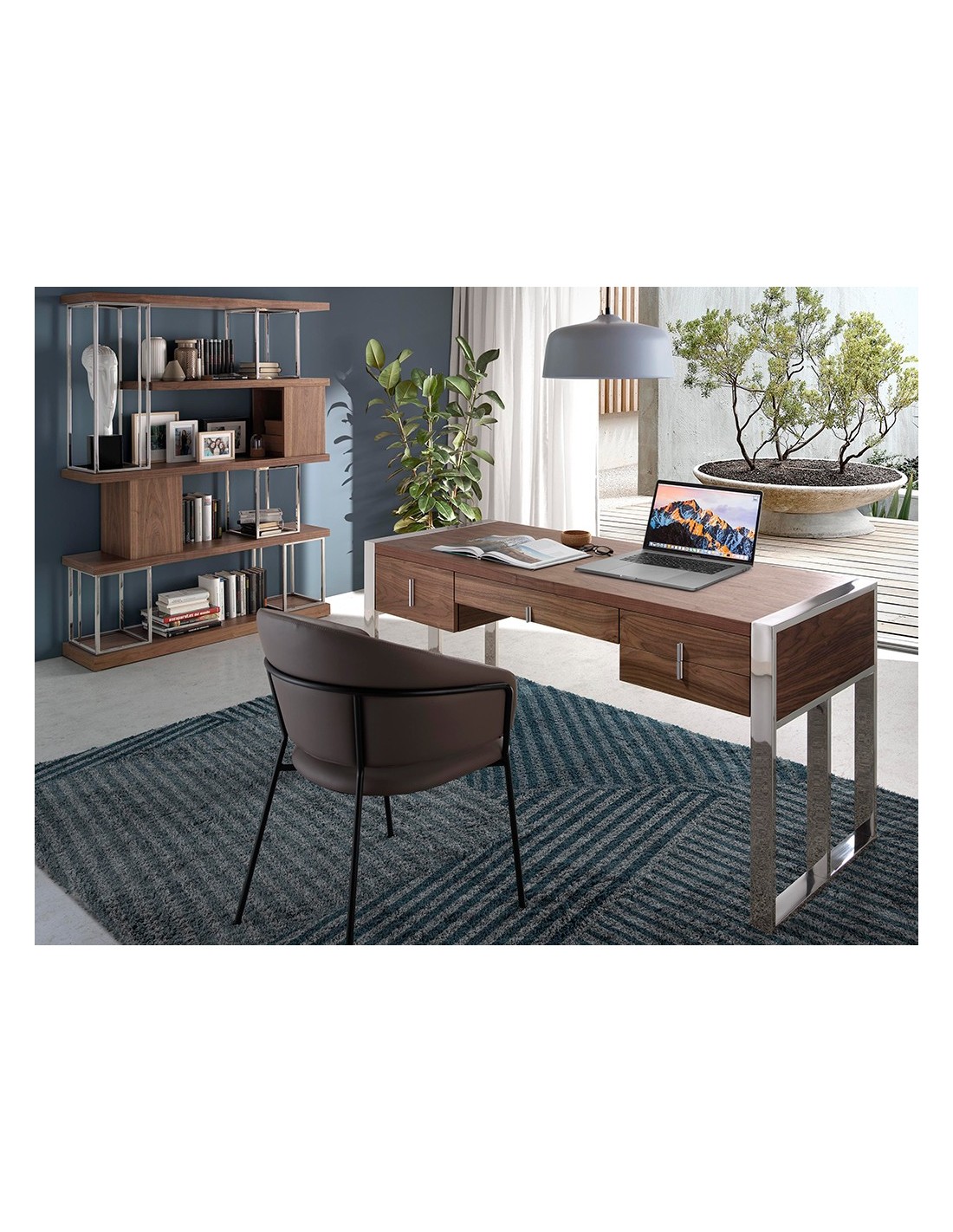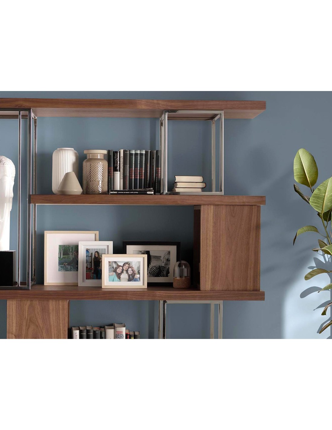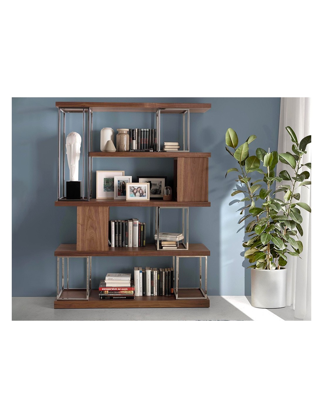 Estantería nogal y acero inoxidable cromado Estantería de madera chapada color nogal. Estructura en acero inoxidable cromado.Medidas del producto: 129 x 35 x 170 cm.- Esta original estantería de diseño moderno aportará calidez y amplitud a cada ambiente de tu hogar, fiel a las últimas tendencias en decoración.- Su carácter versátil y funcional, así como su opción modular, permite que encaje en cualquier tipo de salón, comedor, zona de lectura o despacho.- Todas nuestras estanterías están fabricadas con materiales de la más alta calidad, siendo garantía de mobiliario duradero y funcional.- Por su diseño de líneas rectas y estilo minimalista, conseguirás el toque elegante y personal que buscas para tu hogar.- Combina el diseño más exclusivo y elegante de Angel Cerdá, con la más alta practicidad y funcionalidad de poder mantener todo en orden.