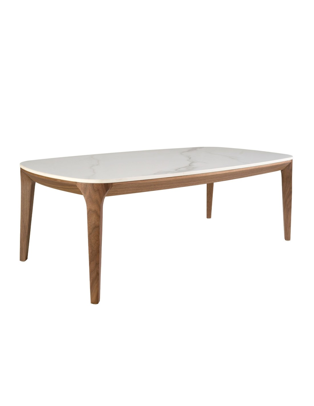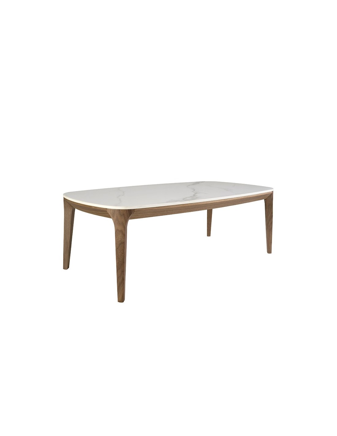 Mesa centro ovalada barril mármol porcelánico y nogal