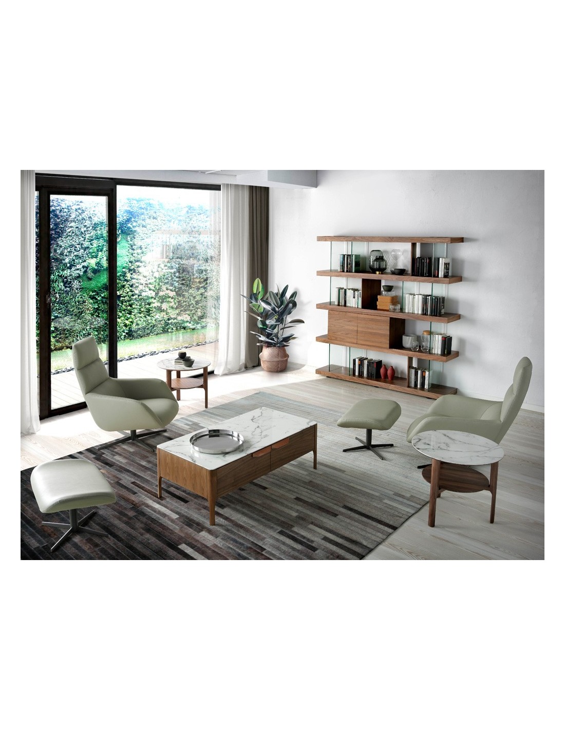 Mesa centro rectangular cristal imitación mármol y nogal