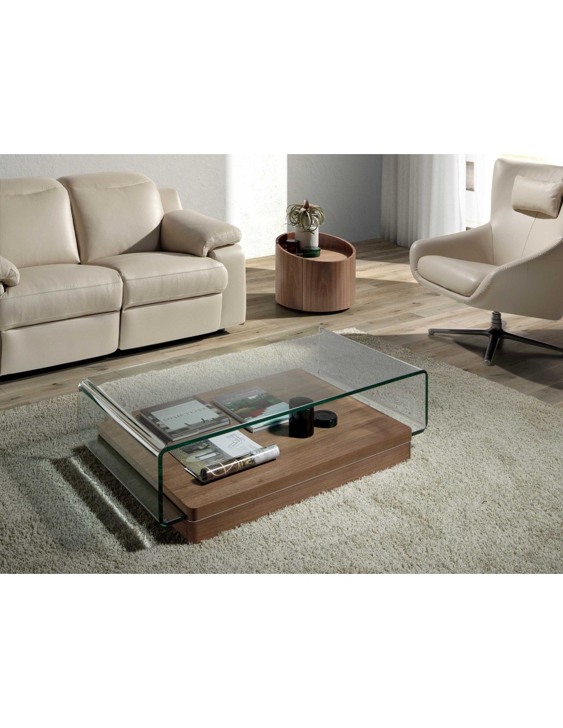 Mesa centro rectangular cristal templado y nogal