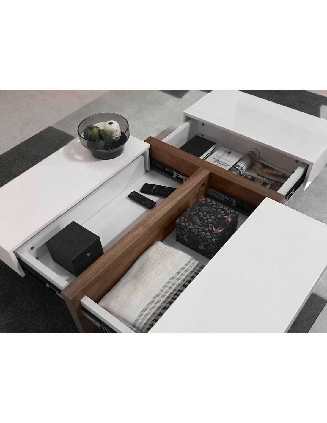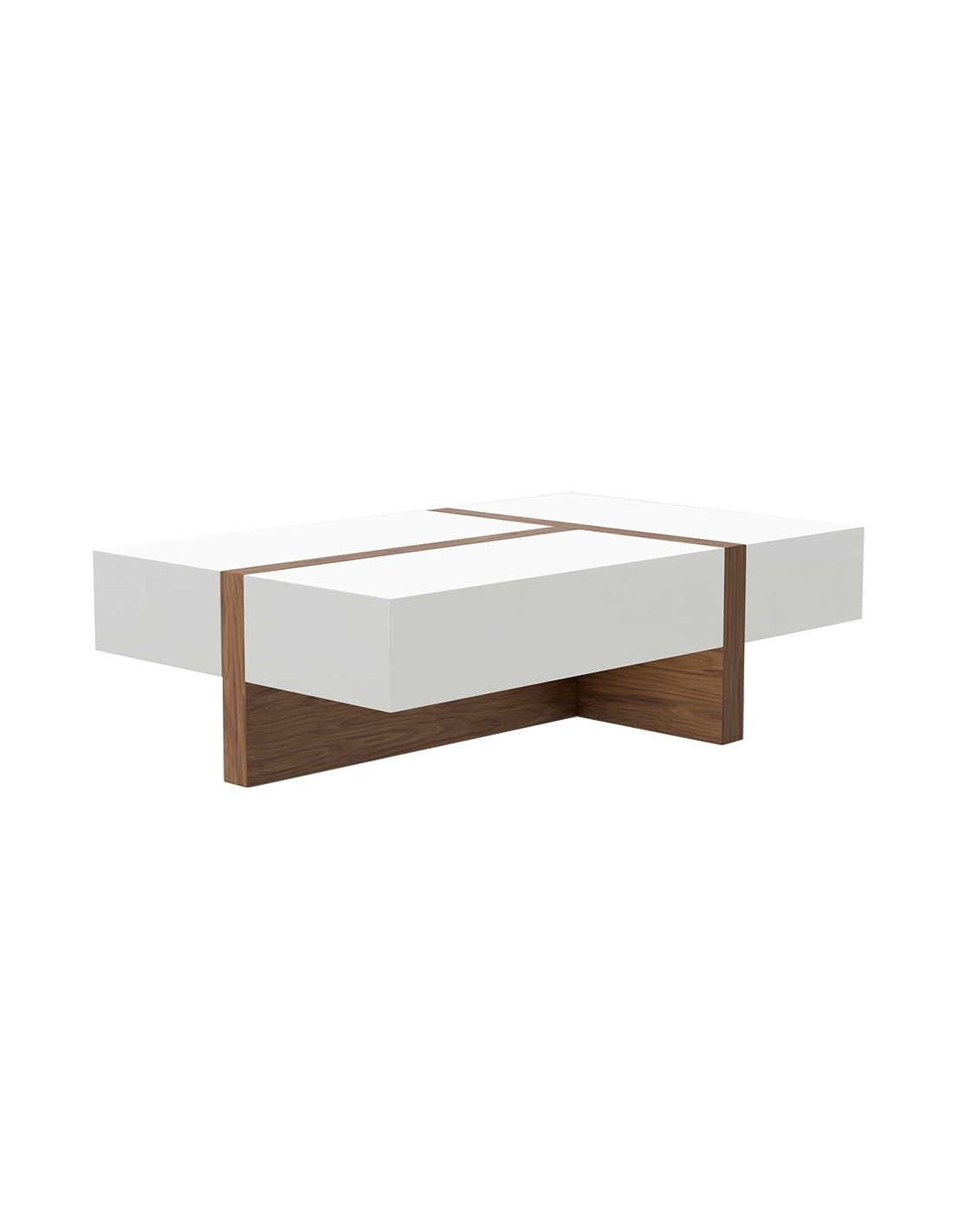 Mesa centro rectangular madera blanco y nogal Mesa centro rectangular de diseño moderno fabricada en madera de MDF color blanco. Su estructura de patas de madera chapada en nogal natural, aporta el toque de modernidad y vanguardia que busca para su hogar. Cuenta con un amplio espacio de almacenaje con 3 cajones con sistema de apertura y cierre uñero. Medidas del producto: 120 x 70 x 35 cm.- Su acabado en madera MDF lacada en color es perfecta para combinar con las últimas tendencias en decoración. - La elegante estructura de patas de madera chapada en nogal natural de 0,5 mm de espesor de esta mesita, es perfecta para crear un ambiente moderno y repleto de estilo. - Su diseño de líneas rectas le permitirá conseguir un ambiente de estilo vanguardista a la vez que sofisticado. - Tanto por su diseño como por su espacio de almacenaje, esta consola es perfecta para crear ambientes amplio y cálidos, a la vez que mantener todo en su sitio.