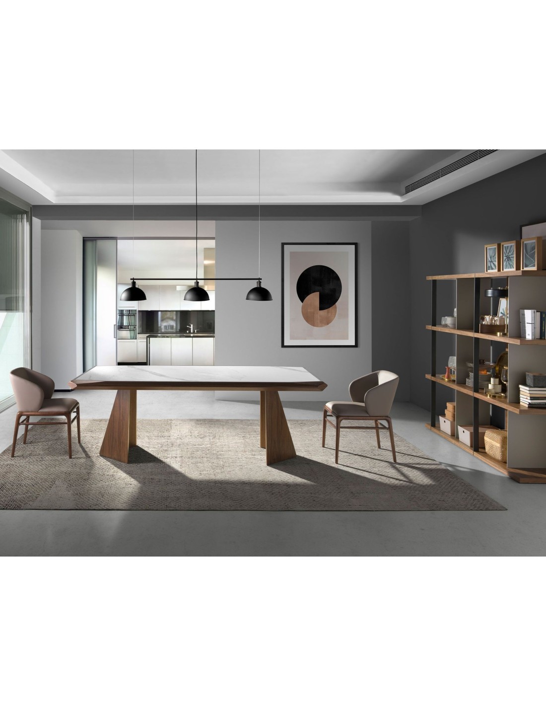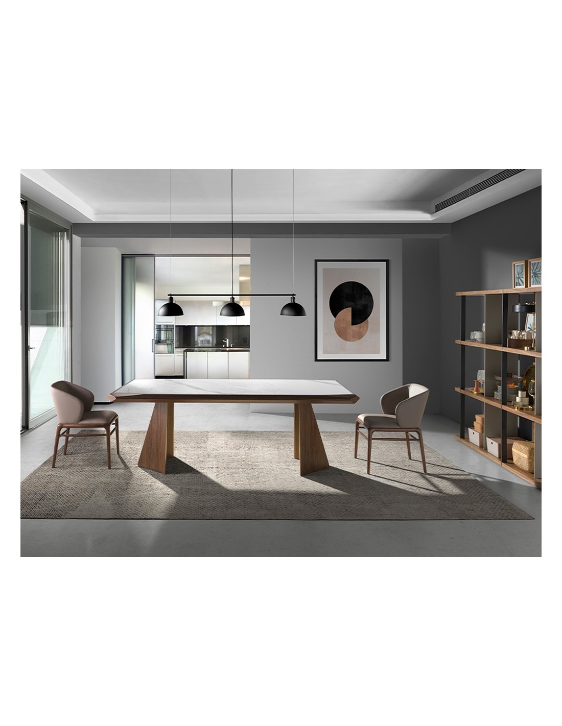 Mesa comedor rectangular mármol porcelánico y nogal