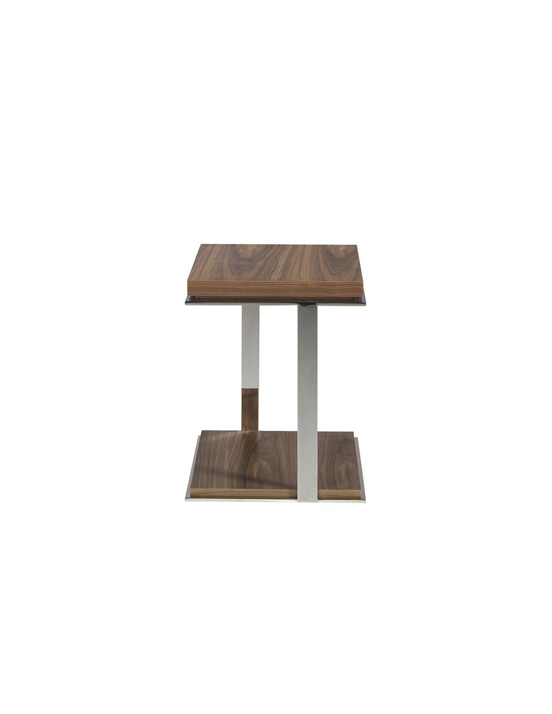 Mesa rincón cuadrada nogal y acero cromado Mesa rincón cuadrada de diseño moderno con tapa de madera chapada en nogal natural y unas originales patas de acero inoxidable cromado. Esta mesa rincón con base de madera chapada en nogal natural es perfecta para aportar luminosidad y vanguardia a su hogar.Medidas del producto: 45 x 45 x 55 cm.- Gracias a su tapa de madera chapada en nogal natural de 0,5 mm de espesor podrá crear un ambiente cálido, acogedor y repleto de estilo. - El acero de sus patas, así como su diseño lineal, permite que encaje en cualquier espacio de su hogar. - Queda apoyada sobre una base de madera chapada en nogal natural, lo que le confiere una mayor estabilidad, así como un estilo único y exclusivo. - Tanto por su diseño como por su estilo moderno, le permitirá crear un ambiente repleto de vanguardia y sofisticación. - Versátil y funcional, su diseño permite que encaje en cualquier ambiente, convirtiéndose en un elemento clave de la decoración de su hogar.