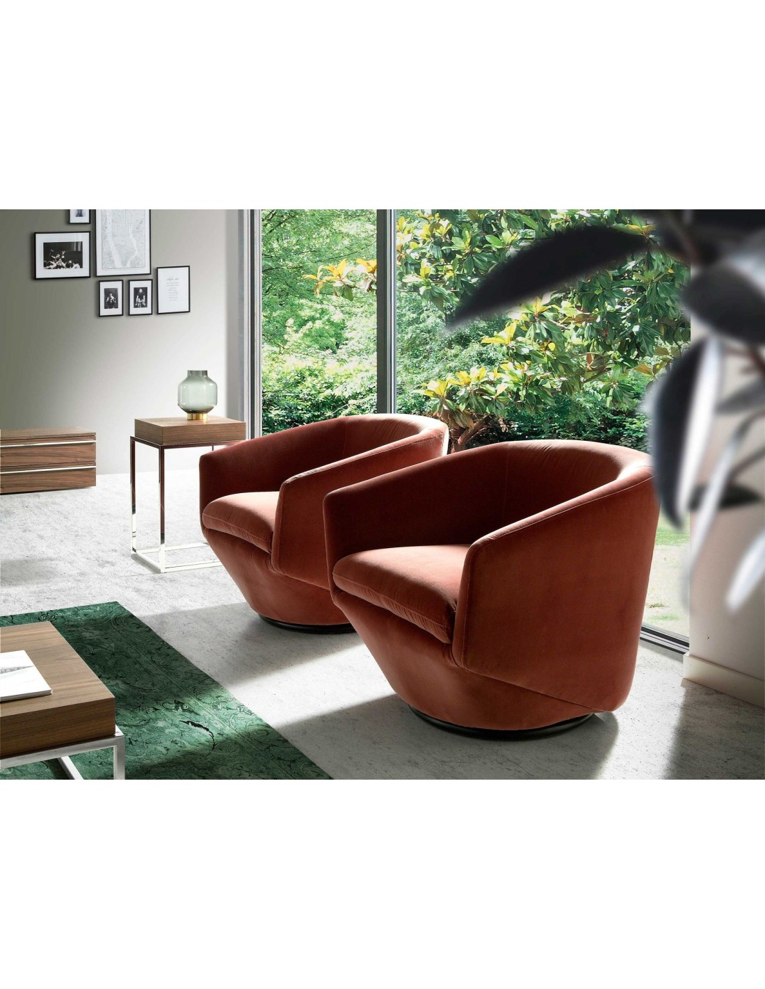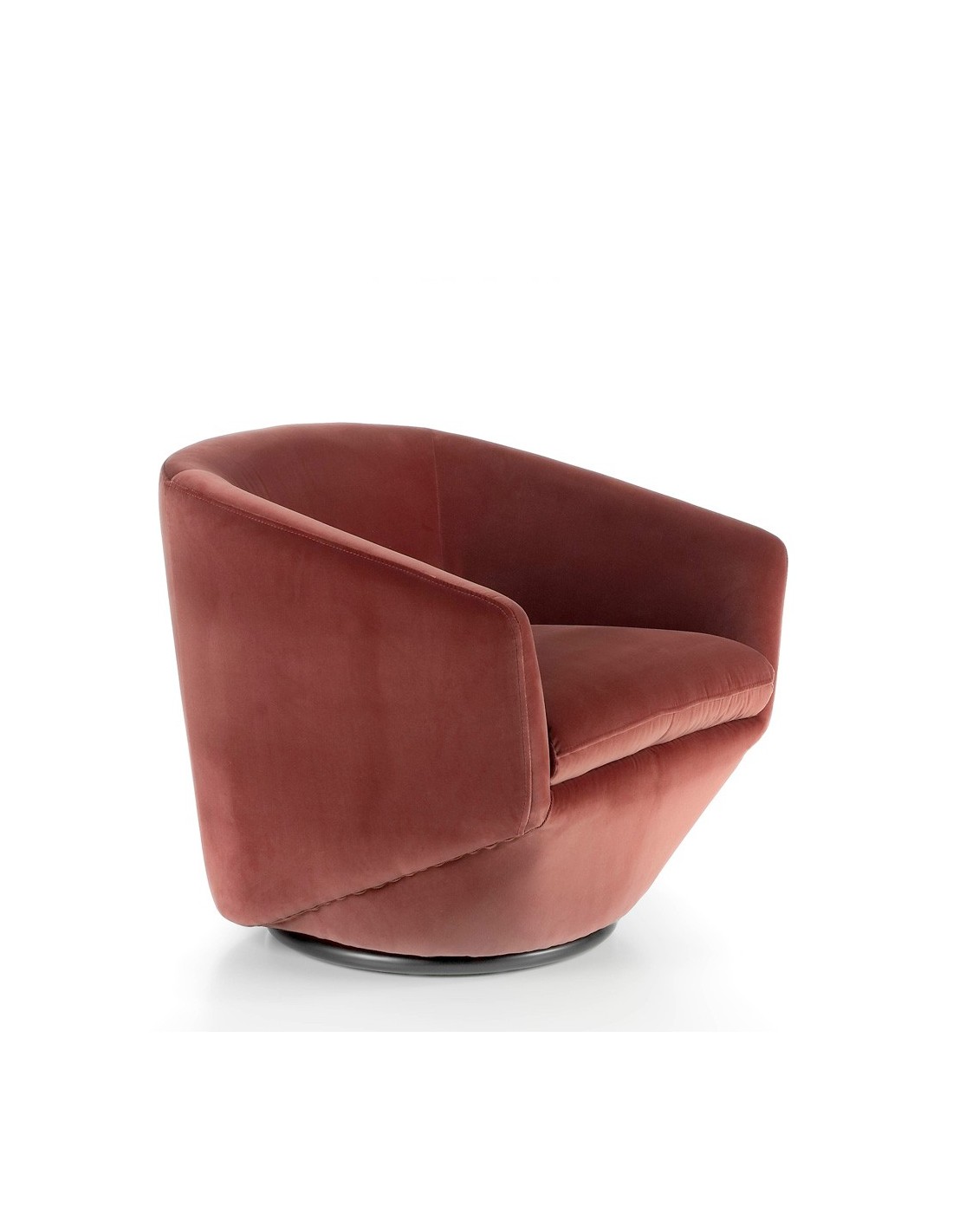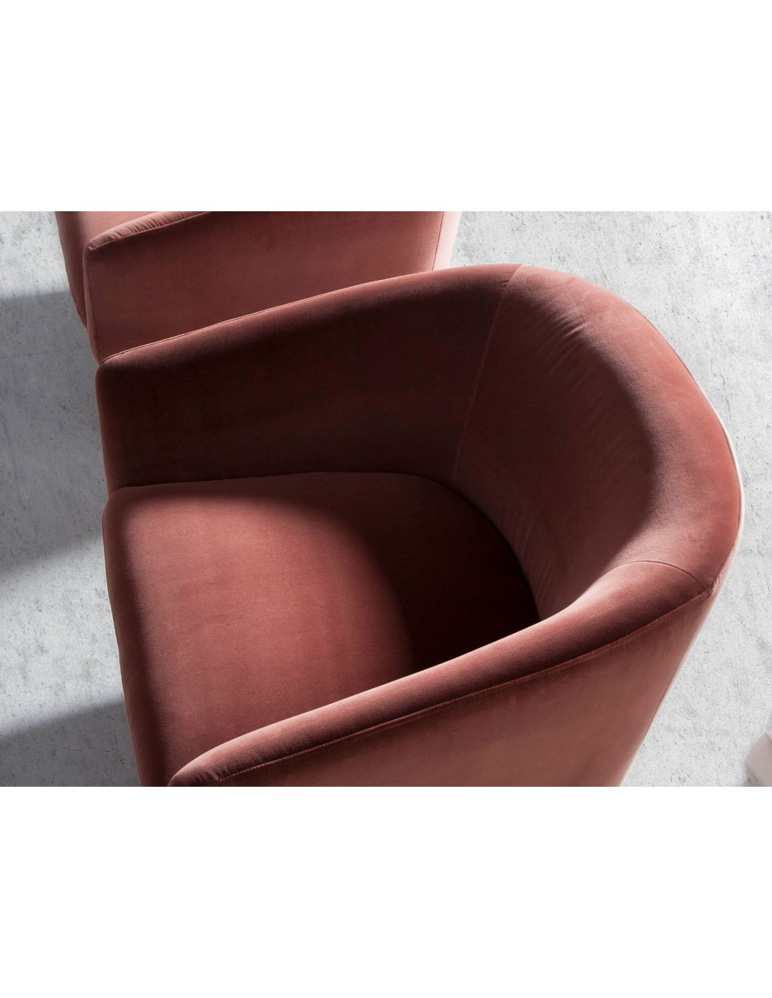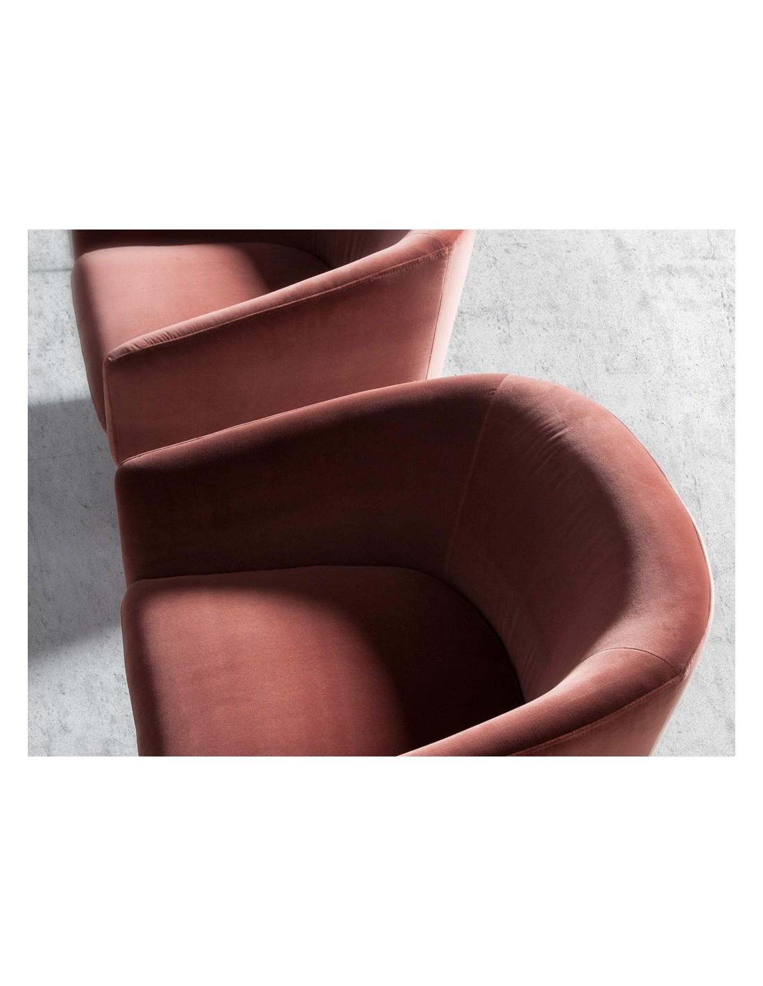 Sillón giratorio terciopelo melocotón Sillón giratorio con reposabrazos de diseño moderno con asiento y respaldo tapizados en tela aterciopelada color melocotón. Tanto por su estilo, como por sus patas de acero inoxidable oscurecido, este sillón giratorio es la combinación perfecta entre diseño y confort.Medidas del producto: 78 x 78 x 70 cm.- El tapizado en tela aterciopelada de este sillón aportará un toque único y diferente, siendo un elemento práctico perfecto para su salón, zona de lectura o descanso. - Tanto por el tamaño de su asiento y su relleno en espuma de poliuretano de 25kg/m3, así como su cómodo respaldo le permitirá contar con el máximo confort, sin dejar de lado el diseño más actual. - Con sistema giratorio, aporta ese plus de practicidad y funcionalidad que busca para su hogar, sin dejar de lado la máxima elegancia.